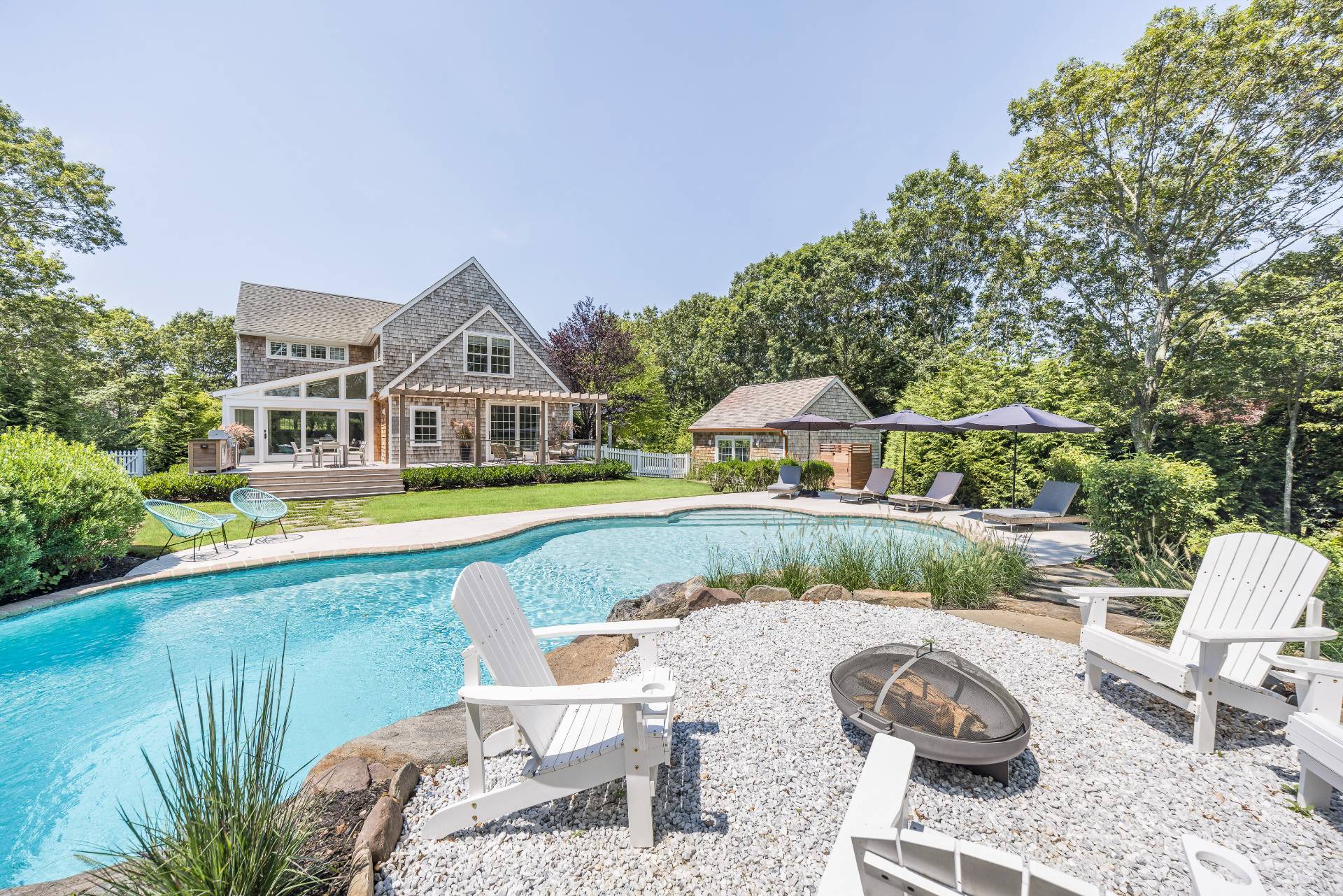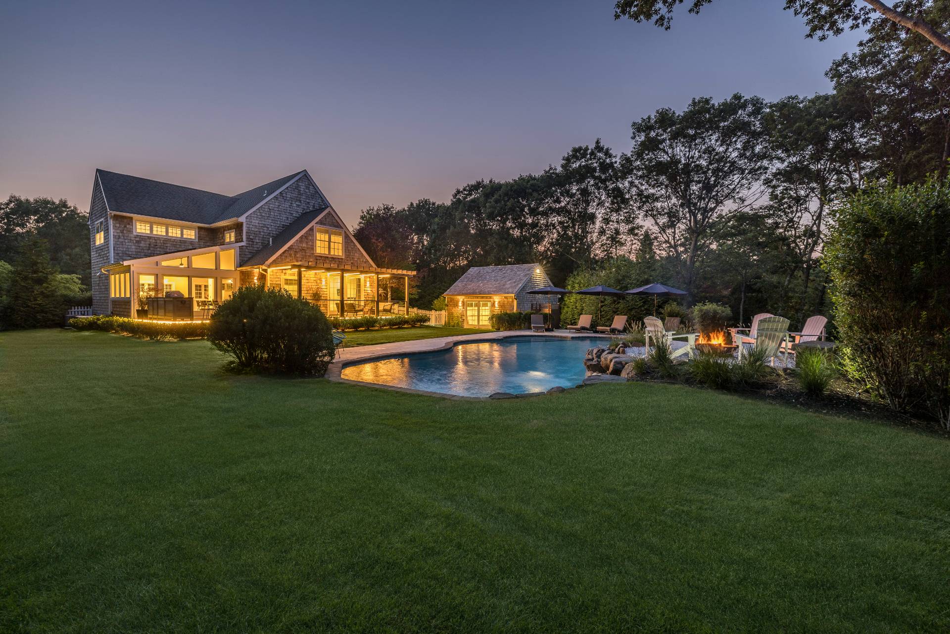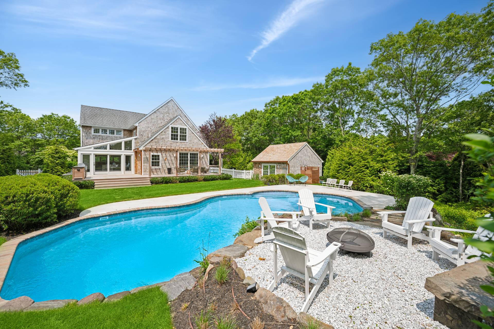 BEING SOLD TURN-KEY (art-work not included) Conceived by award-winning architect Joseph Eisner, AIA, LEED AP, and newly completed to perfection, this modern masterpiece is the latest creation of a preeminent home design aficionado, featured in prominent publications and sought-after by the most discerning. Nestled in a quiet, coveted cul-de-sac, 20 Cove Neck Lane boasts an incomparable location, resting moments from beautiful Fish Cove, minutes to Southampton Village, North Sea Harbor, Peconic Bay and pristine ocean beaches, as well as the Southampton Youth Services Fitness Center and Tennis Club. Set on a lush .84 acres of elevated grounds, the exquisite 4-bedroom 4.5-bathroom gem abuts 10 acres of reserve land for the ultimate peace and privacy. An expansive 4375 square feet of luxurious living space is met by serene and stunning outdoor environs that afford a perfect backdrop for entertaining. Lounge and dine alfresco on the generous wood deck with a built-in grill and fridge, or enjoy summer swims in the sparkling in-ground pool. Refined interiors are light, bright and spacious, offering gorgeous views of greenery and an open-concept layout for the host. The wonderful great room with wide-plank wood floors and a sleek wood-burning fireplace is complemented by a lovely dining alcove enveloped by windows. The brand new state-of-the-art kitchen is tailored to the chef, styled in white with abundant cabinetry, stone countertops, and a large island with extra seating. A sky-lit sunroom with a ceiling fan and tile flooring extends the kitchen/party area, offering huge sliding glass doors leading to the pool and outdoor oasis. Among the additional highlights are primary suites on 2 levels (one accessing the deck and pool), 3 additional guest rooms, all new high-end spa baths, a newly-added finished lower level, full laundry room with storage, refreshing outdoor shower, and oversized detached 2-car garage. Every detail of this exceptional upscale home has been thoughtfully considered for optimal aesthetics, functionality, and sustainability. Topping the allure is the premier address, in close proximity to all the attractions of Southampton, Bridgehampton, Sag Harbor and Water Mill, and an easy commute to Manhattan!
