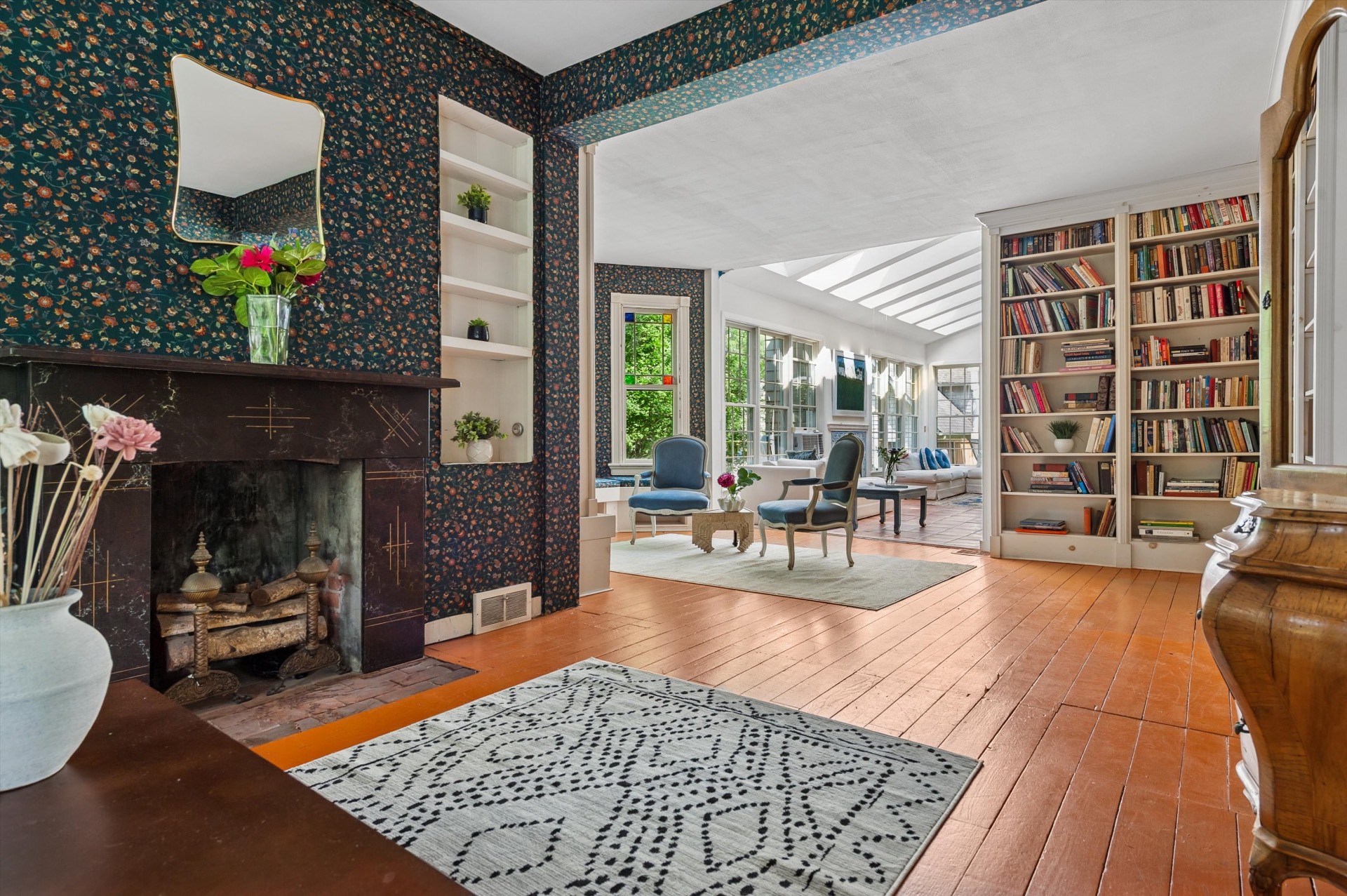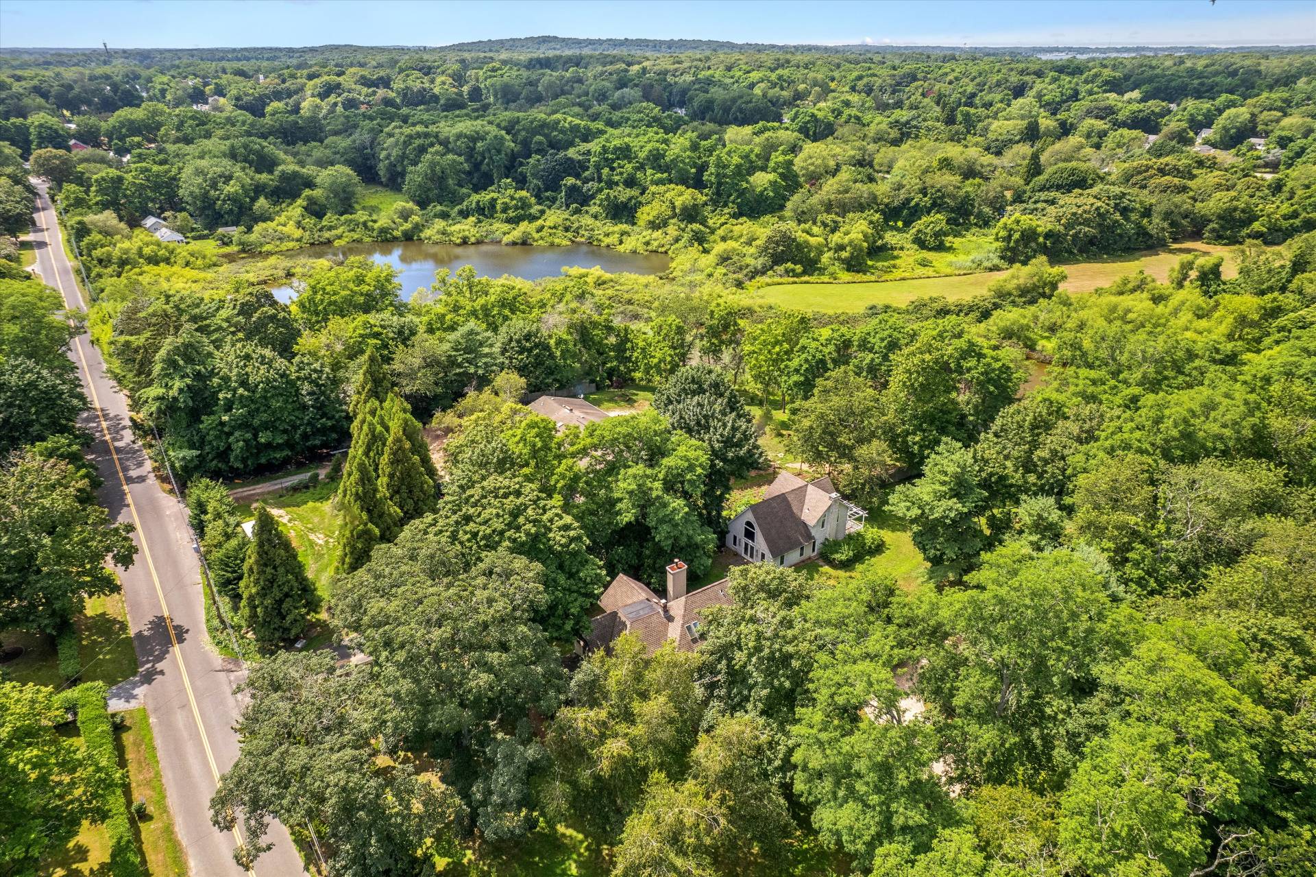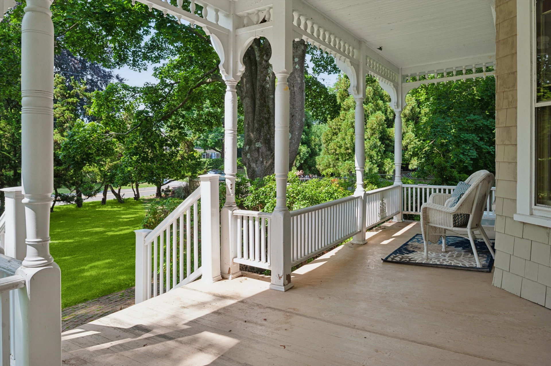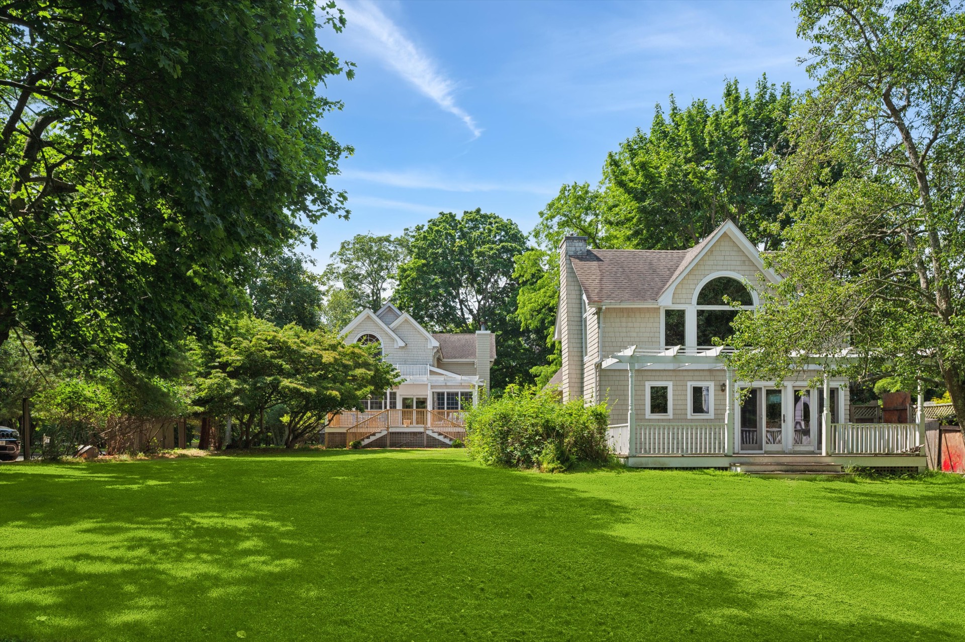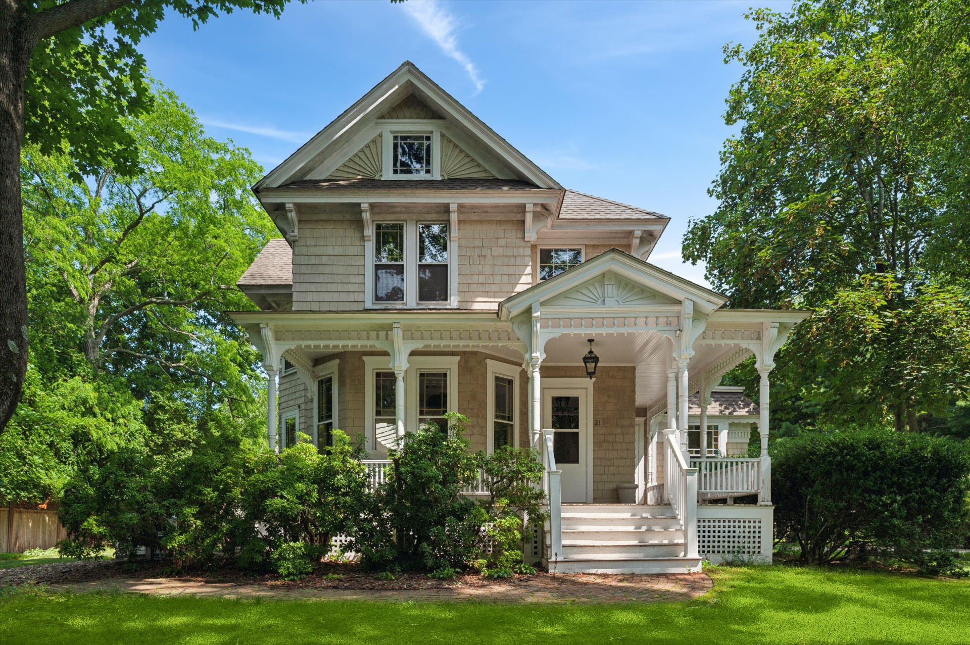 Set across two separate lots totaling 2.24 acres-21 Congdon (0.68 acres with residence and "artist studio" shell) and 23 Congdon (1.56 acres)-this exceptional property offers 186± feet of frontage on the peaceful waters of Lily Pond. Made for modern day entertaining, a wide front porch sets the tone for the gracious interiors. Step into the welcoming entry foyer where original stained glass windows transoms scatter dappled light across the interiors in every room on both floors, infusing the space with timeless character throughout the home. To the left, a light-filled parlor with a fireplace and ornately carved original stone mantel opens into a cozy library nook featuring a window seat, custom built-ins, and space for intimate conversation. Toward the rear of the home, a generous open-plan kitchen and lounge area with skylights and a fireplace is perfect for entertaining or unwinding. A large island with cooktop and proper exterior ventilation anchors the kitchen, while a nearby powder room adds convenience. Sliding glass doors lead to a spacious and newly updated deck perfect for alfresco dining while enjoying views of Lily Pond. Off the kitchen, the formal dining room dazzles with original millwork, a grand crystal chandelier, and access to the outdoor veranda-perfect for relaxing in the shade with a book. Upstairs, the sunlit primary suite features dramatic half-moon windows, two walk-in closets, and a serene ensuite bath. Two additional rooms, perfect for children, guests or office space -one with vaulted ceilings-and a full bath complete the second level. Modern upgrades include a whole-house generator (installed in 2017) and a new gas heating unit. Also on the property is a 1,518-square-foot, two-story artist's studio-currently a blank canvas ready to be transformed to suit your vision. Centrally located and one block from Coecles Harbor, this home blends historic charm, natural beauty, and sprawling grounds-an exceptional opportunity in one of Shelter Island's most private enclaves. Anchored in local history, this Shelter Island Classic sits on the site of Jonathan Nicoll Havens' former estate, the "Great Central Mansion," and where the affectionately named historic "Sweet House" once stood circa 1886. Recent property taxes for 21 Congdon Road were $8,224.71 and property taxes for 23 Congdon Road were $2,380.05.