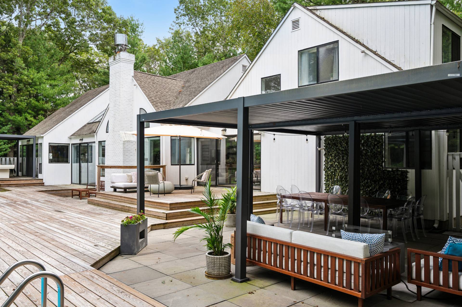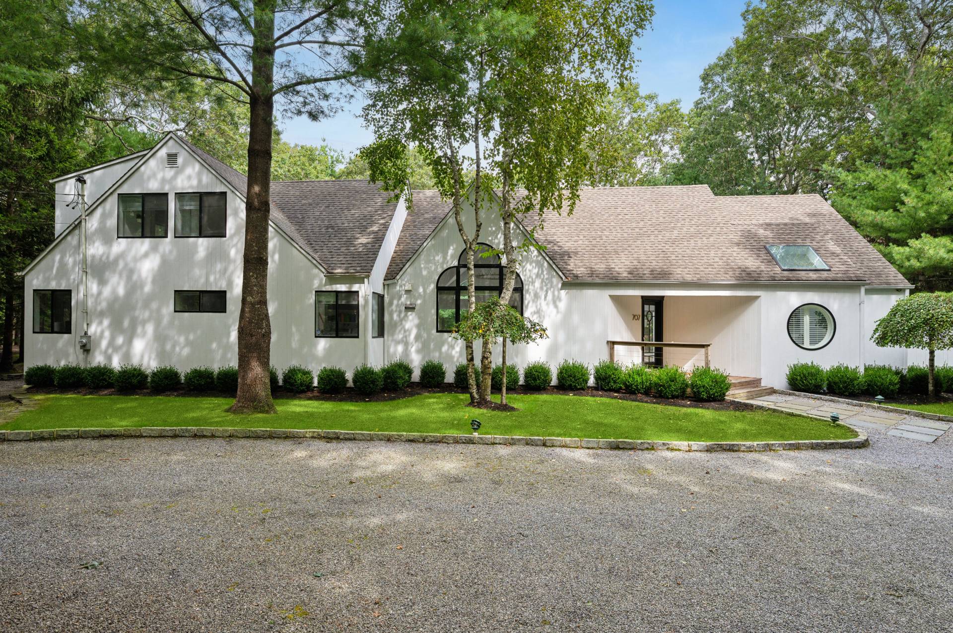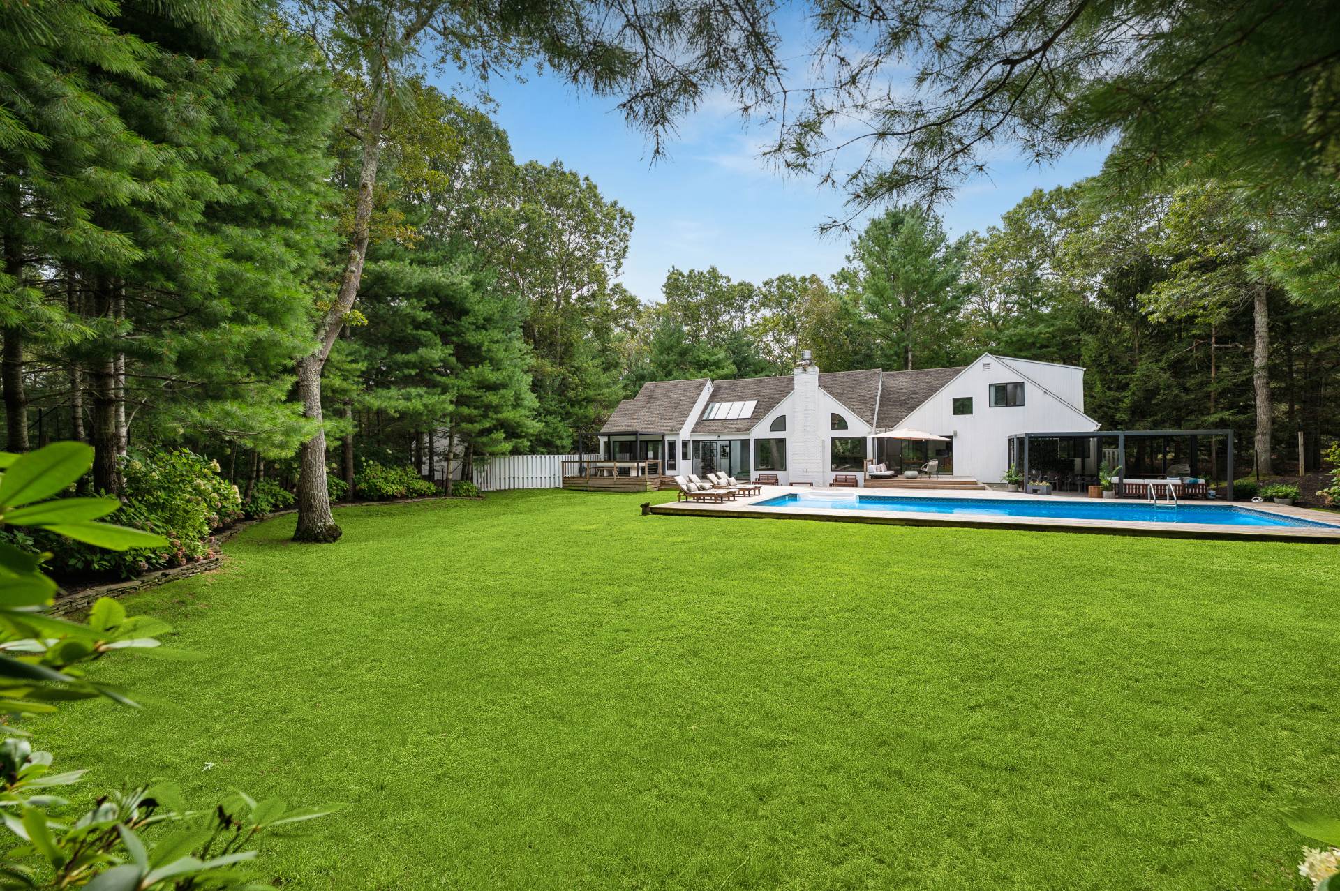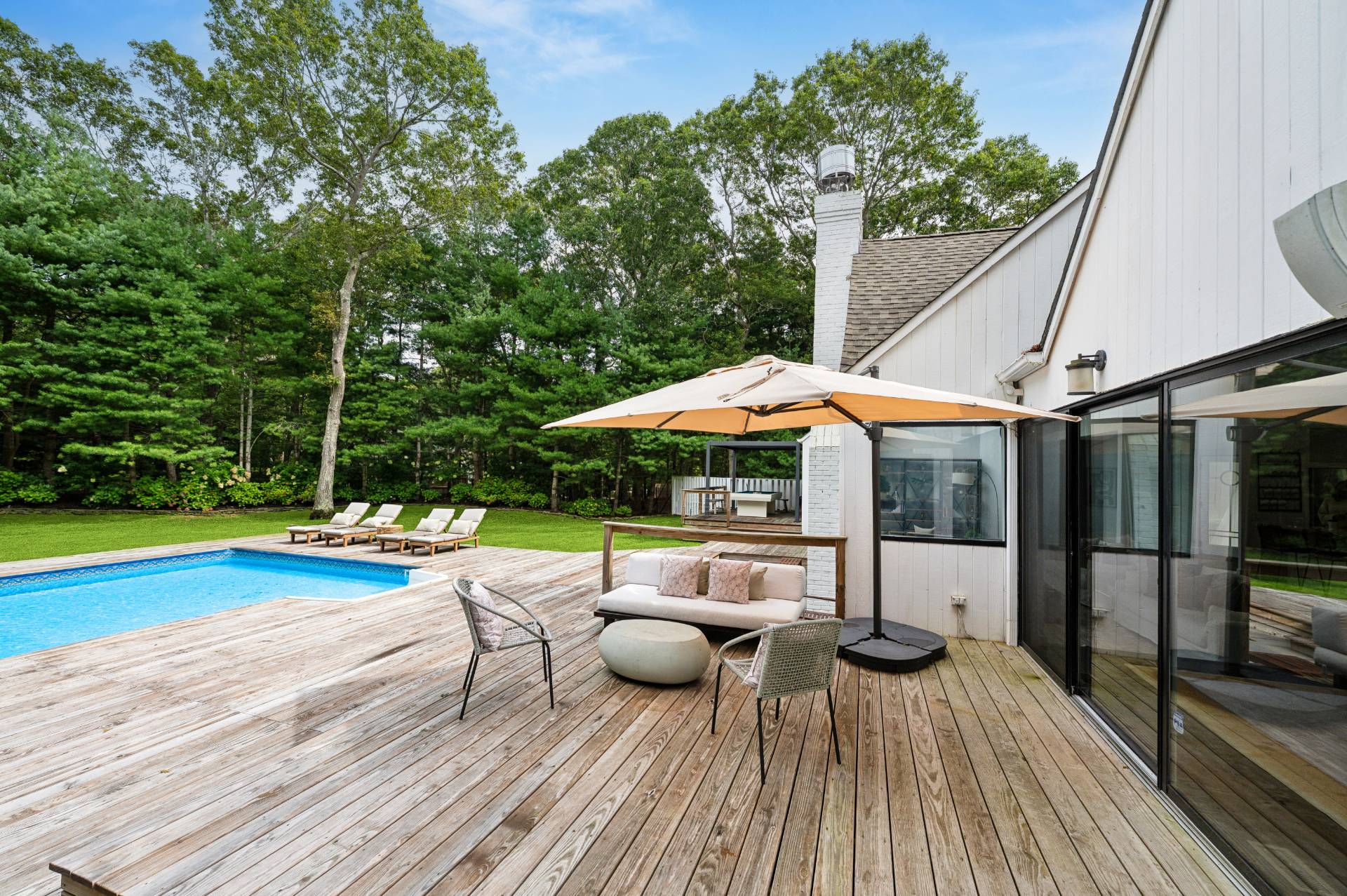 Set behind a circular drive on over 1.5 acres just moments from Three Mile Harbor, this contemporary retreat is designed for relaxed Hamptons living. The airy, open layout connects the living room, great room, and kitchen, with walls of glass and sliders bringing in natural light all day long. The first-floor primary suite is its own private sanctuary, complete with a spacious bath and direct access to a secluded deck. Two additional bedrooms on the main level make entertaining a breeze, while upstairs, a junior suite with a sitting area offers a perfect getaway for guests. Step outside to a sweeping entertaining deck and heated pool, surrounded by trees for privacy and quiet-an ideal setting for summer weekends and year-round enjoyment. A full-height basement offers potential for finishing, while the detached two-car garage provides storage for all your water or land toys.