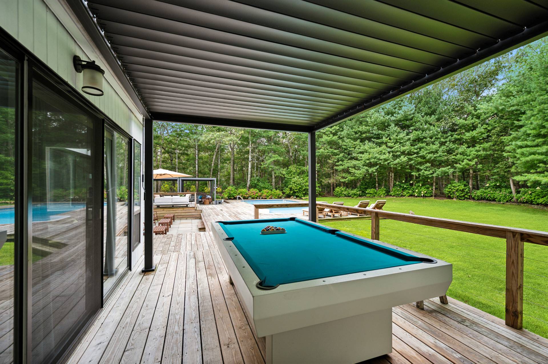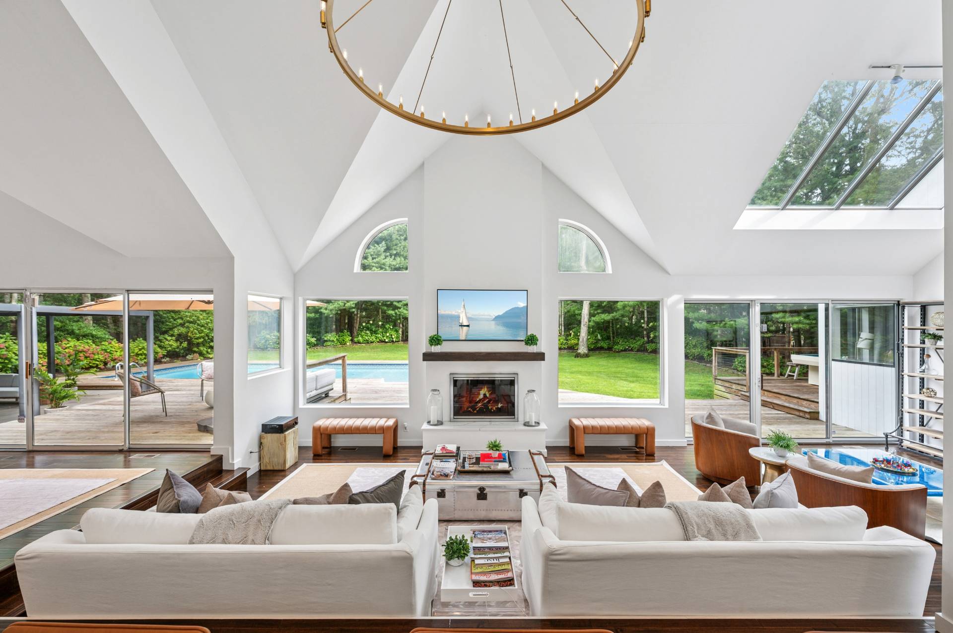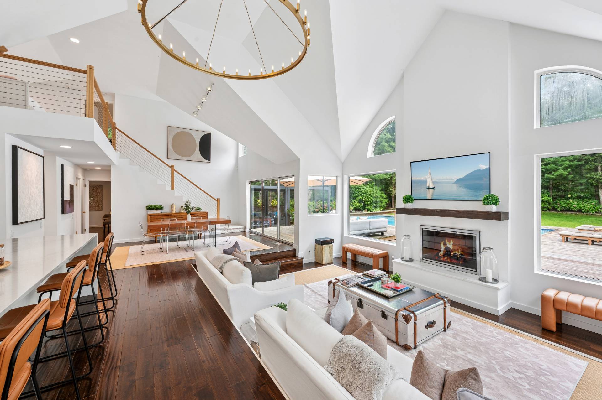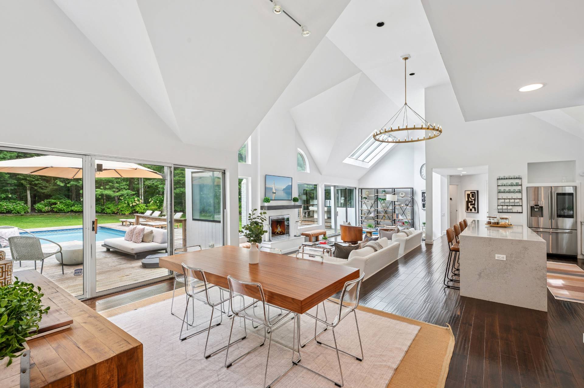 Set behind a circular drive on over 1.5 acres just moments from Three Mile Harbor, this contemporary retreat is designed for relaxed Hamptons living. The airy, open layout connects the living room, great room, and kitchen, with walls of glass and sliders bringing in natural light all day long. The first-floor primary suite is its own private sanctuary, complete with a spacious bath and direct access to a secluded deck. Two additional bedrooms on the main level make entertaining a breeze, while upstairs, a junior suite with a sitting area offers a perfect getaway for guests. Step outside to a sweeping entertaining deck and heated pool, surrounded by trees for privacy and quiet-an ideal setting for summer weekends and year-round enjoyment. A full-height basement offers potential for finishing, while the detached two-car garage provides storage for all your water or land toys.