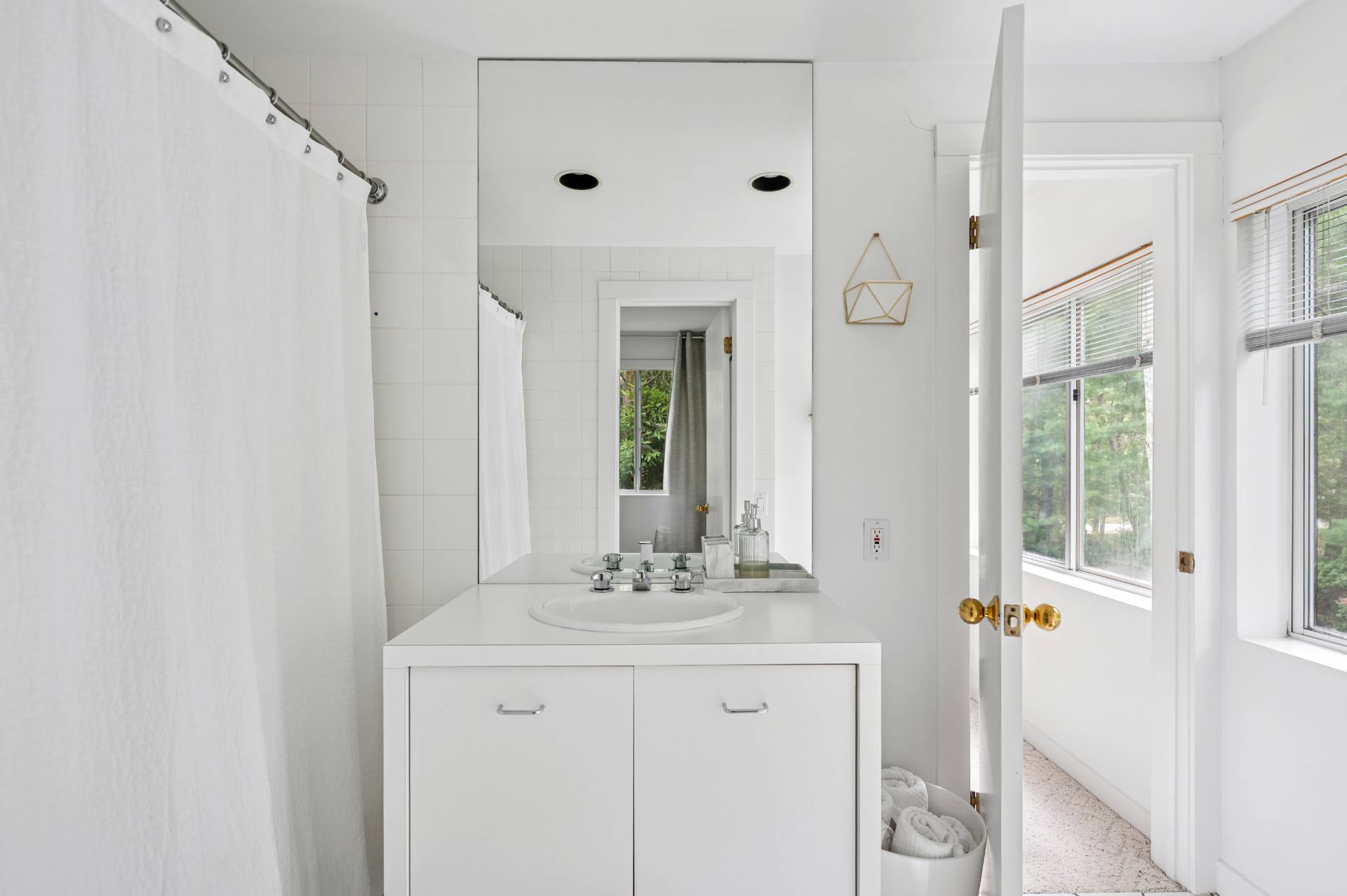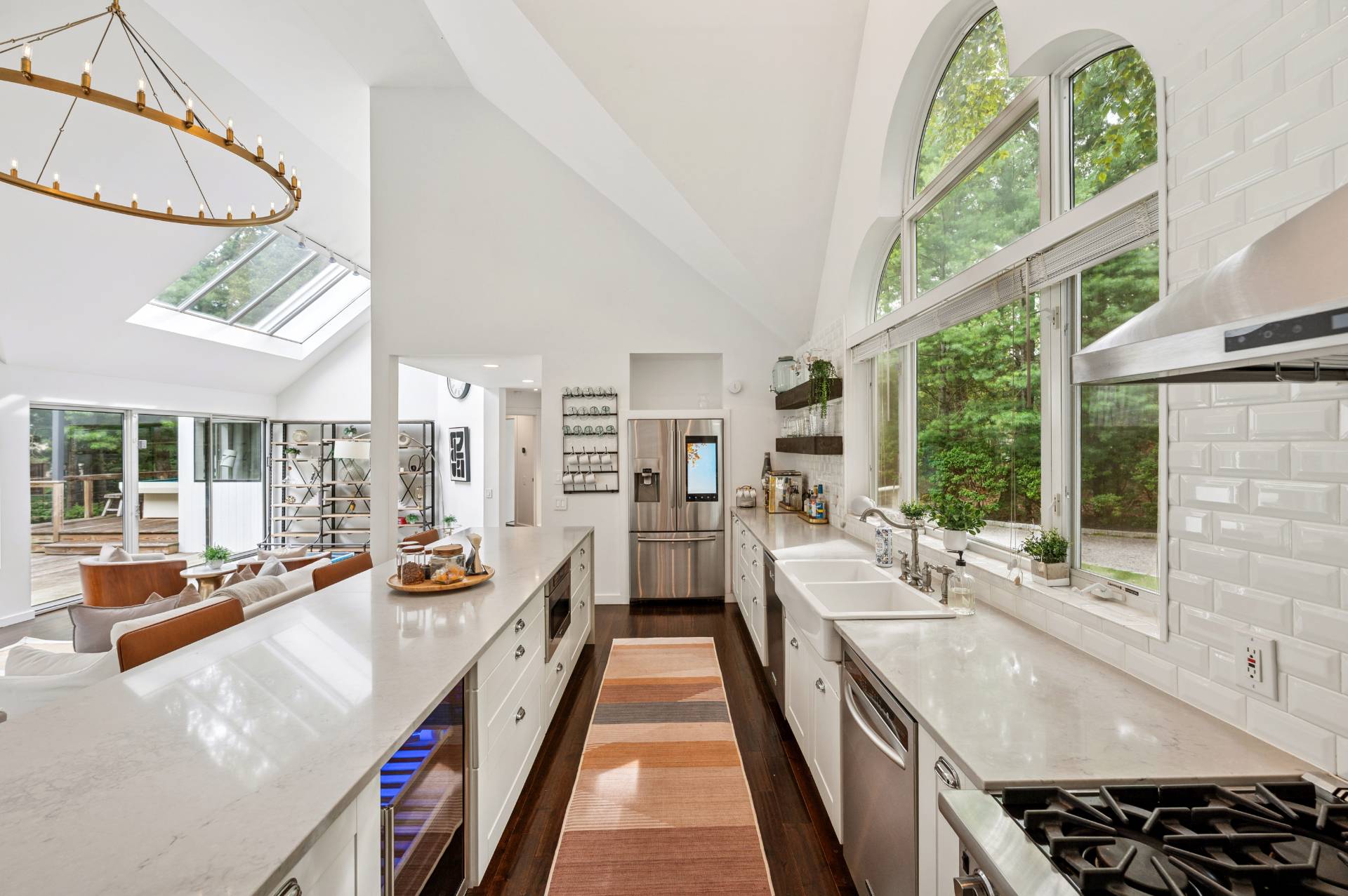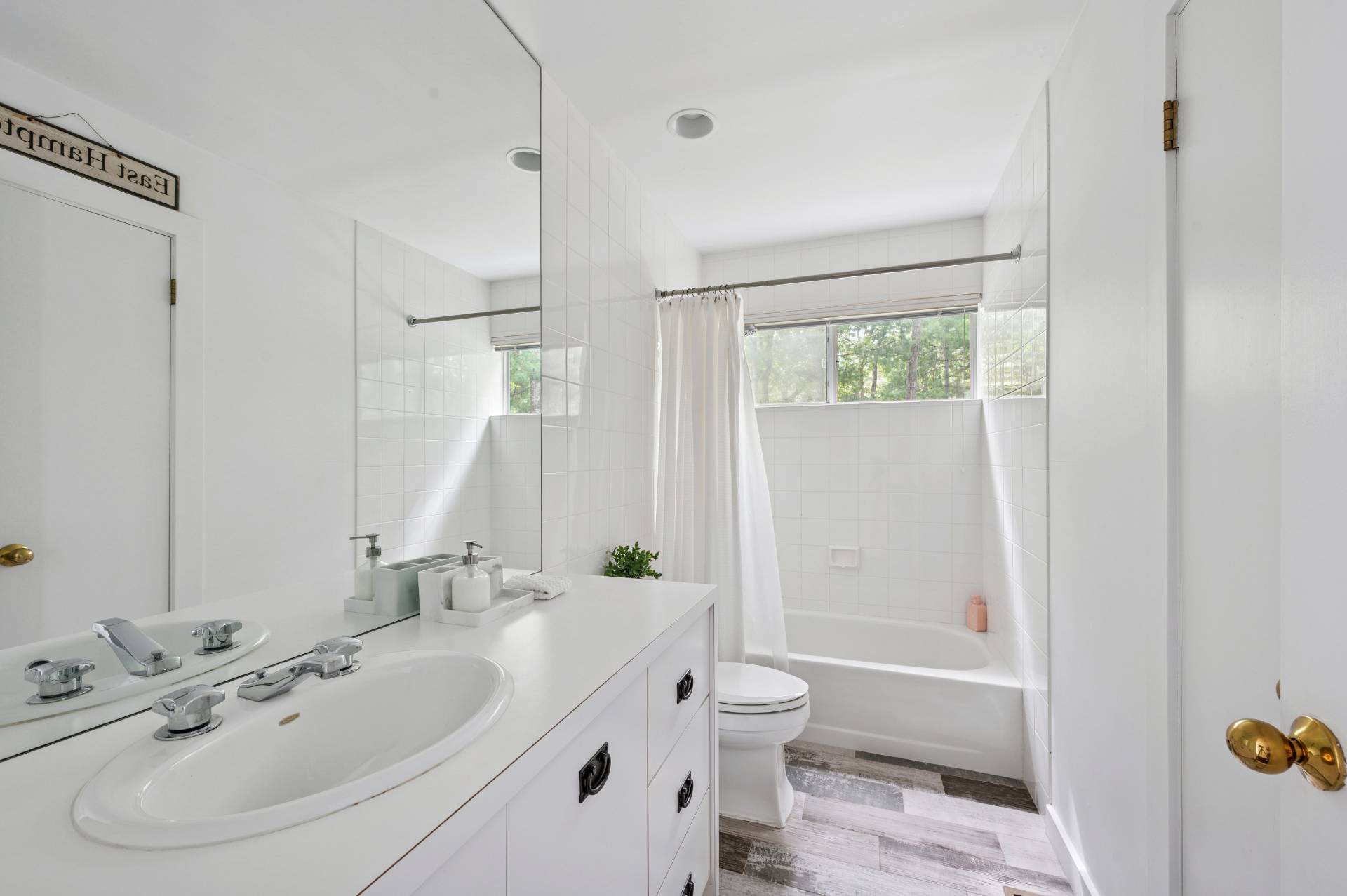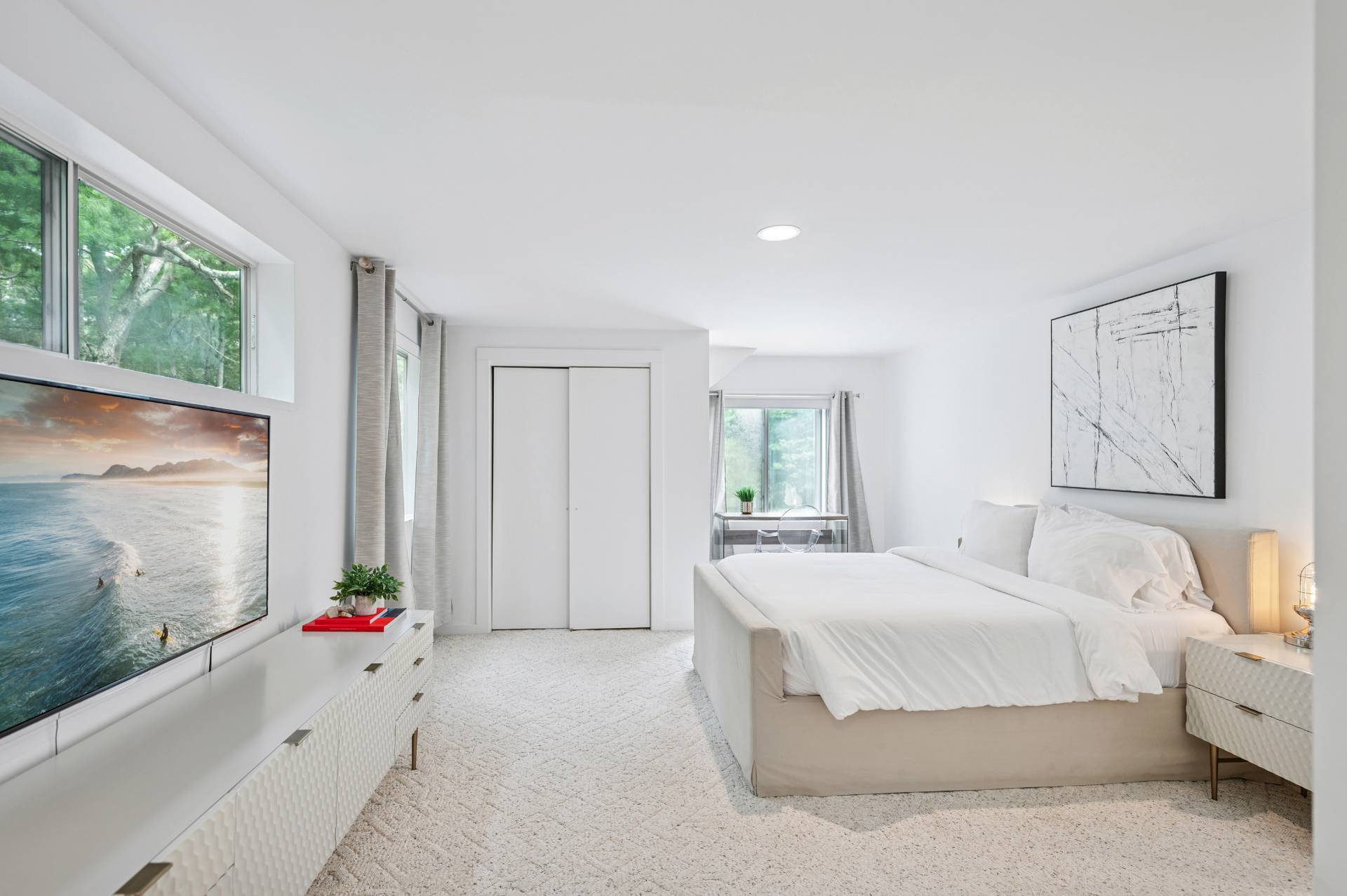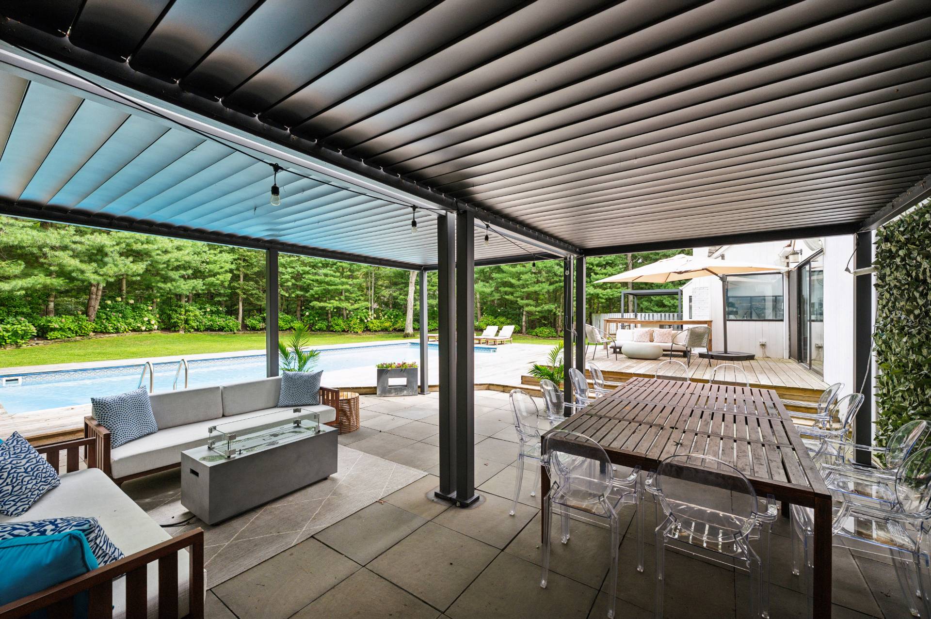 Set behind a circular drive on over 1.5 acres just moments from Three Mile Harbor, this contemporary retreat is designed for relaxed Hamptons living. The airy, open layout connects the living room, great room, and kitchen, with walls of glass and sliders bringing in natural light all day long. The first-floor primary suite is its own private sanctuary, complete with a spacious bath and direct access to a secluded deck. Two additional bedrooms on the main level make entertaining a breeze, while upstairs, a junior suite with a sitting area offers a perfect getaway for guests. Step outside to a sweeping entertaining deck and heated pool, surrounded by trees for privacy and quiet-an ideal setting for summer weekends and year-round enjoyment. A full-height basement offers potential for finishing, while the detached two-car garage provides storage for all your water or land toys.