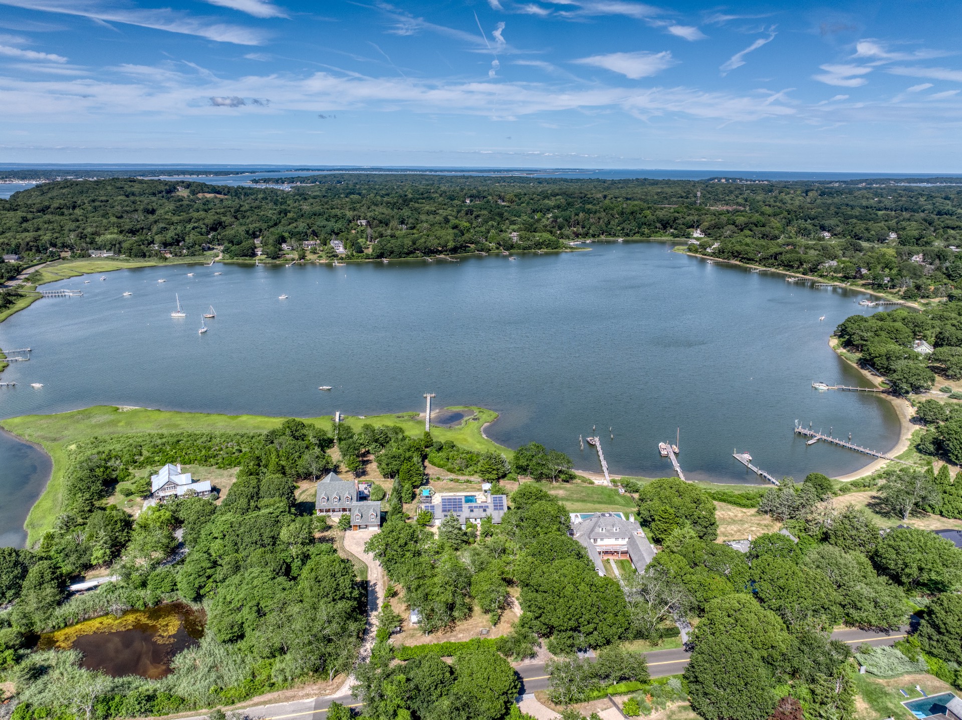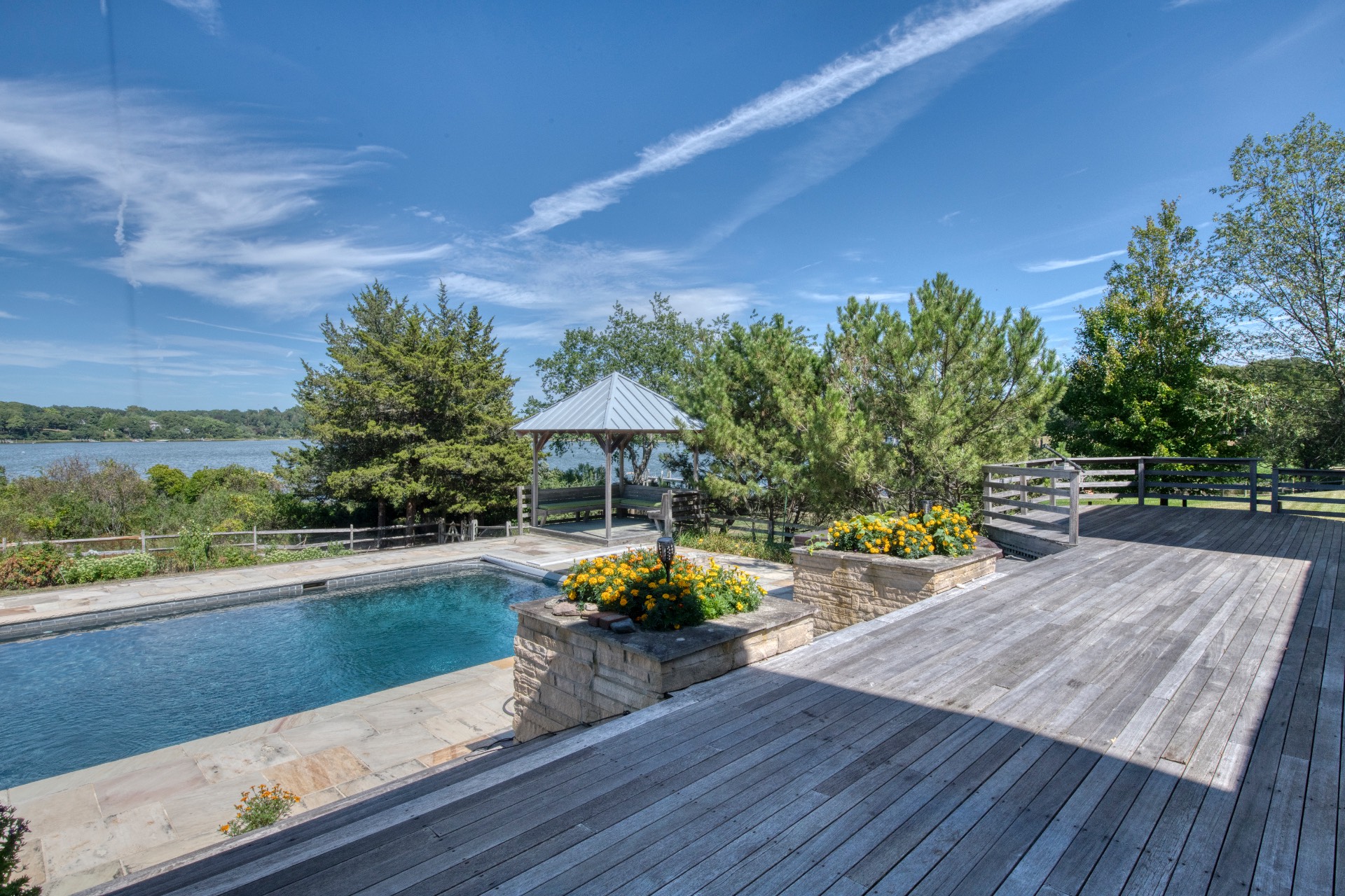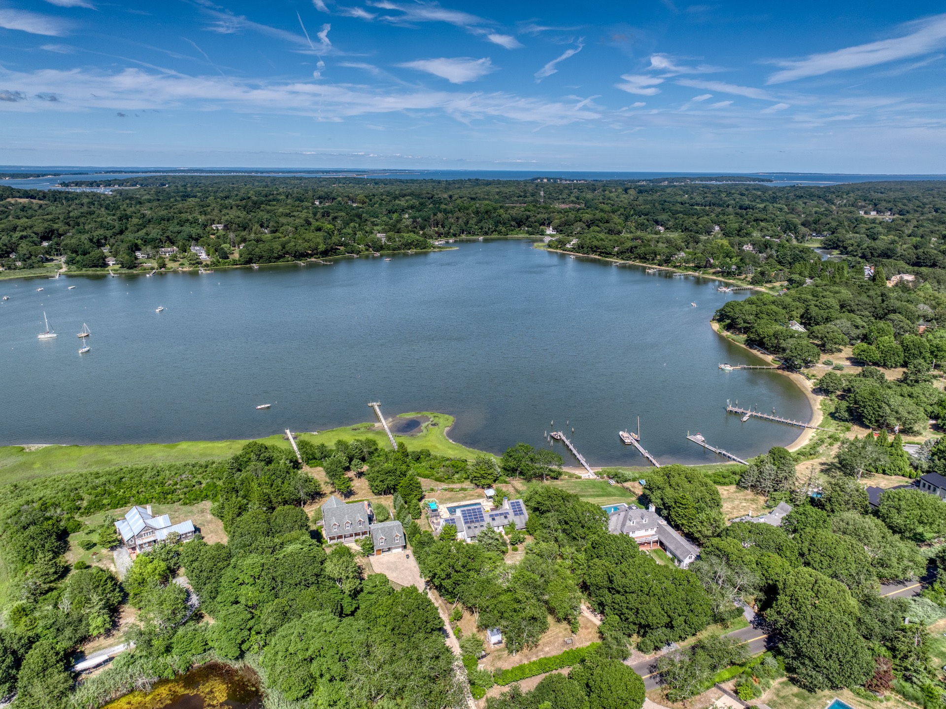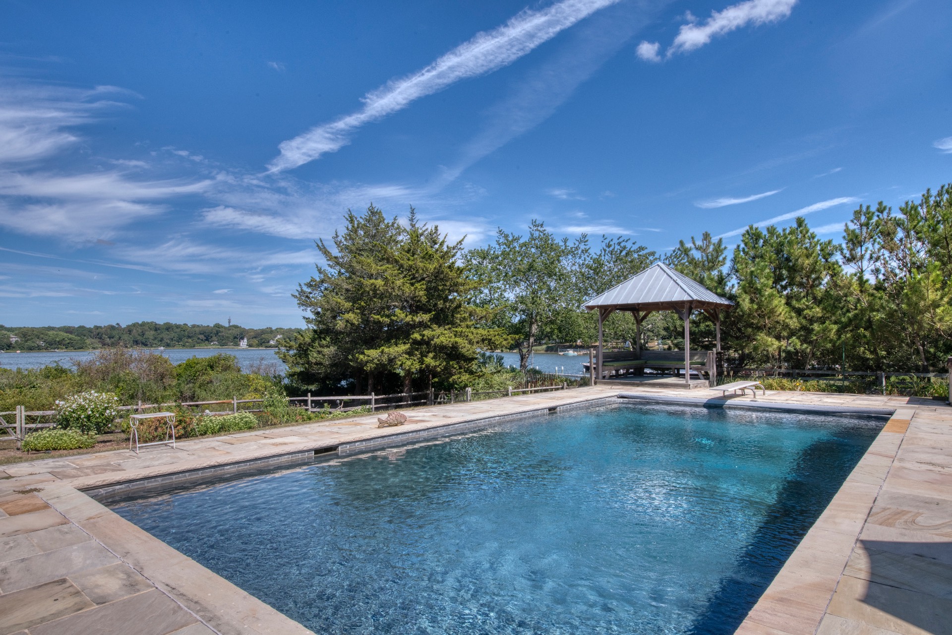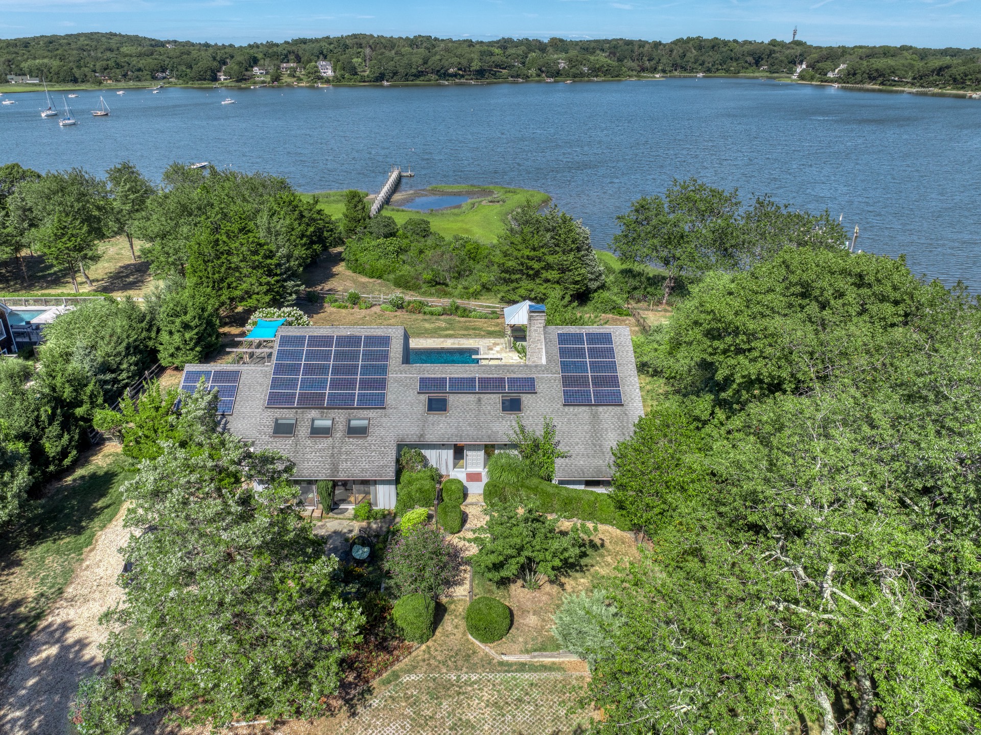 Stunning waterfront views overlooking West Neck Bay in the Westmoreland area of Shelter Island. This 4 bedroom, 3.5 bath Contemporary on 1.4 beautiful acres has an open plan living and dining area with stone fireplace, beamed and vaulted ceilings with expansive glass across the waterside overlooking a large deck, heated gunite pool, patio with outdoor kitchen, gazebo and dock. The main floor also has a kitchen with waterview, convenient pantry, 1/2 bath, art studio overlooking a charmingly landscaped water lily pond with specimen plants and flowers plus a two car garage on the west side of the common areas and full bath with two bedrooms, one of which has water views and deck, on the east side. The second floor is accessed by two staircases leading to a large primary ensuite bedroom with private bath, jaccuzzi tub, separate shower, office and balcony deck on one side and a private guest suite with bath and balcony deck on the other. The views from this floor are spectacular. The large finished basement has access to a stone patio leading out to the waterfront and has ample storage and utility rooms. The waterside is an amazing area for entertaining and relaxation with beautiful heated pool, patio, deck, reading, hammock and grilling areas. The property is lovingly landscaped and accessed by a private drive with large parking area. Fully heated with central air conditioning and extensive solar panelling, this home makes a wonderful vacation or year round living experience surrounded by nature, open skies and sea.