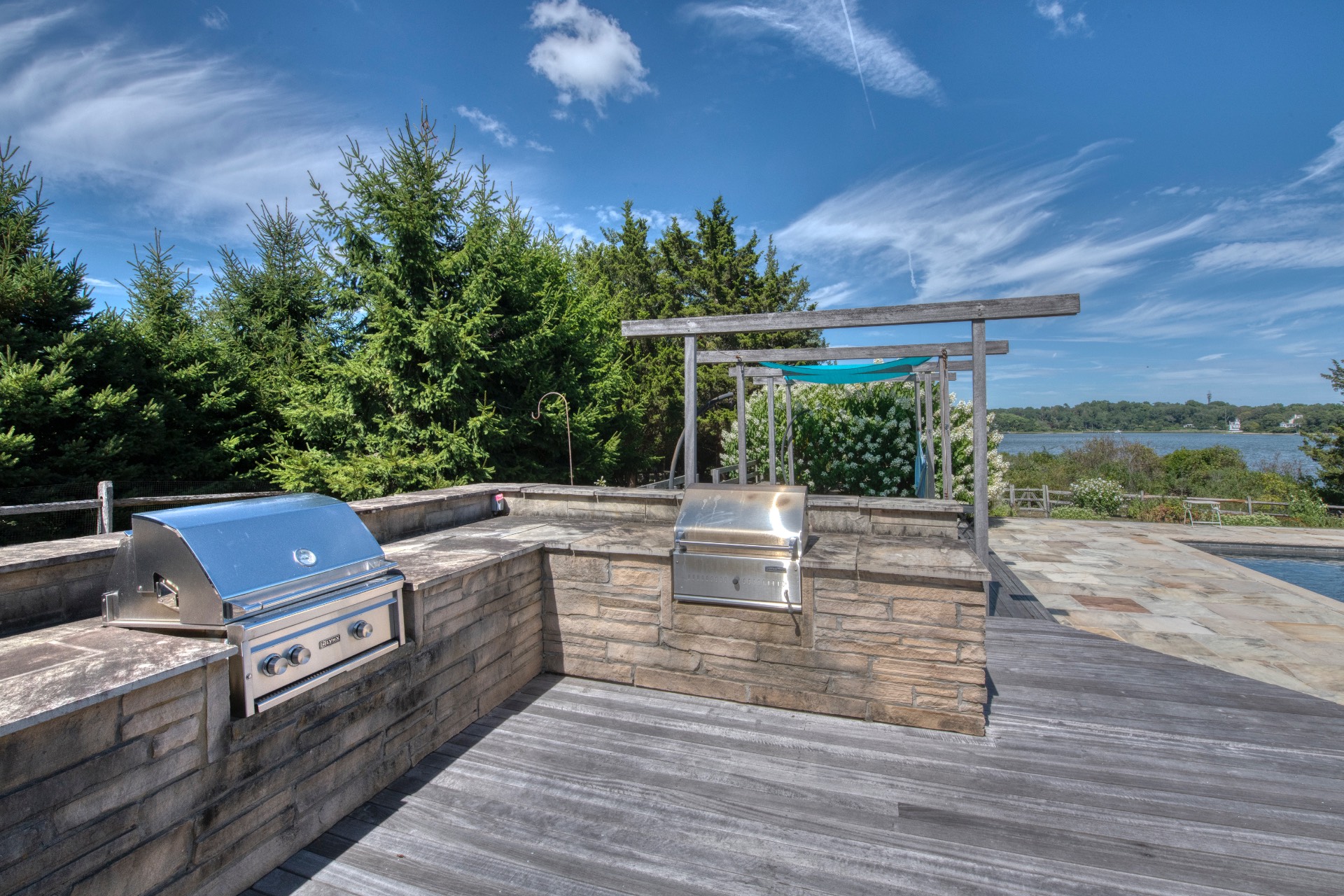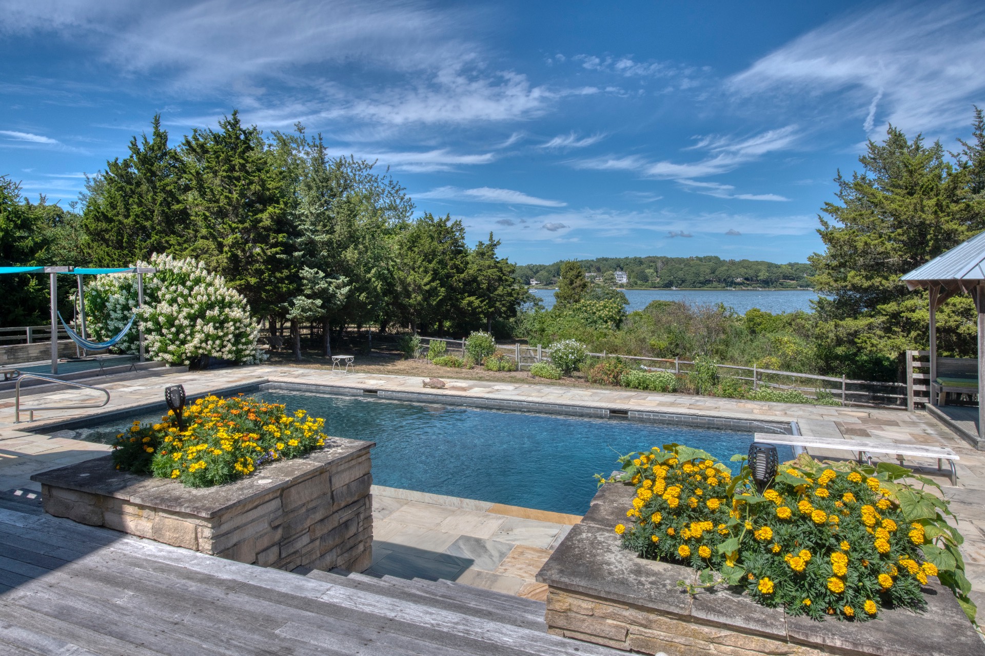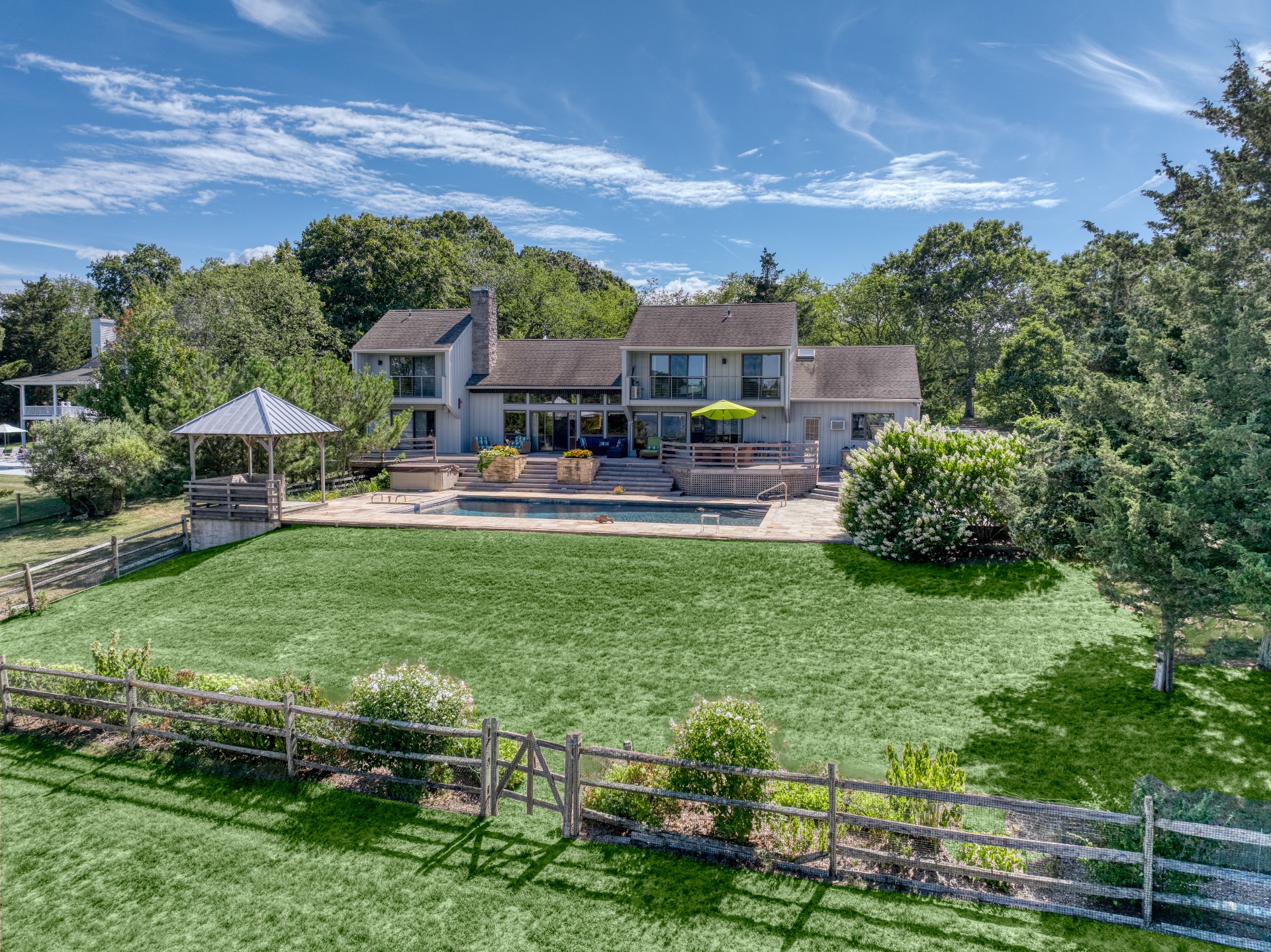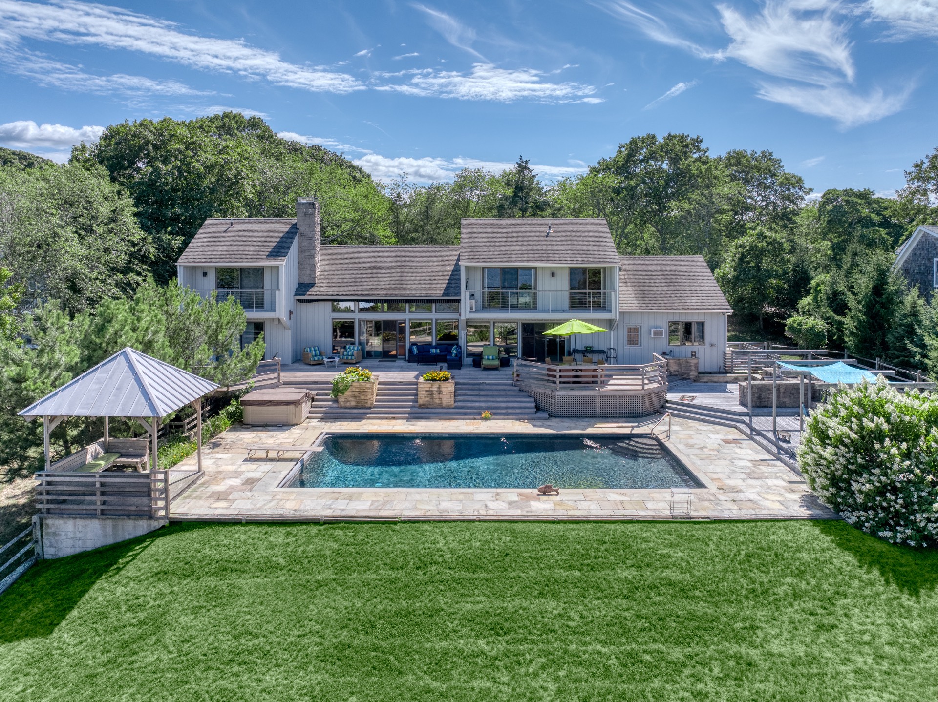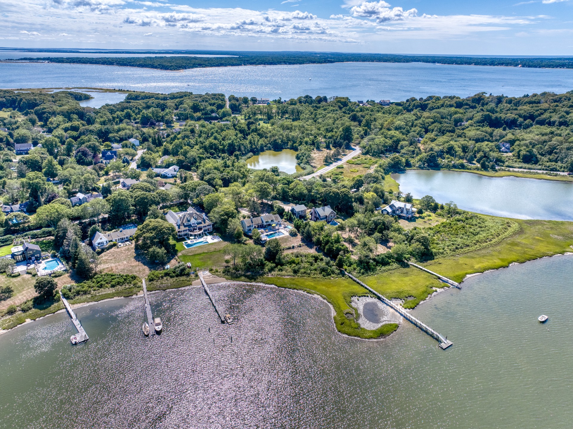 Stunning waterfront views overlooking West Neck Bay in the Westmoreland area of Shelter Island. This 4 bedroom, 3.5 bath Contemporary on 1.4 beautiful acres has an open plan living and dining area with stone fireplace, beamed and vaulted ceilings with expansive glass across the waterside overlooking a large deck, heated gunite pool, patio with outdoor kitchen, gazebo and dock. The main floor also has a kitchen with waterview, convenient pantry, 1/2 bath, art studio overlooking a charmingly landscaped water lily pond with specimen plants and flowers plus a two car garage on the west side of the common areas and full bath with two bedrooms, one of which has water views and deck, on the east side. The second floor is accessed by two staircases leading to a large primary ensuite bedroom with private bath, jaccuzzi tub, separate shower, office and balcony deck on one side and a private guest suite with bath and balcony deck on the other. The views from this floor are spectacular. The large finished basement has access to a stone patio leading out to the waterfront and has ample storage and utility rooms. The waterside is an amazing area for entertaining and relaxation with beautiful heated pool, patio, deck, reading, hammock and grilling areas. The property is lovingly landscaped and accessed by a private drive with large parking area. Fully heated with central air conditioning and extensive solar panelling, this home makes a wonderful vacation or year round living experience surrounded by nature, open skies and sea.