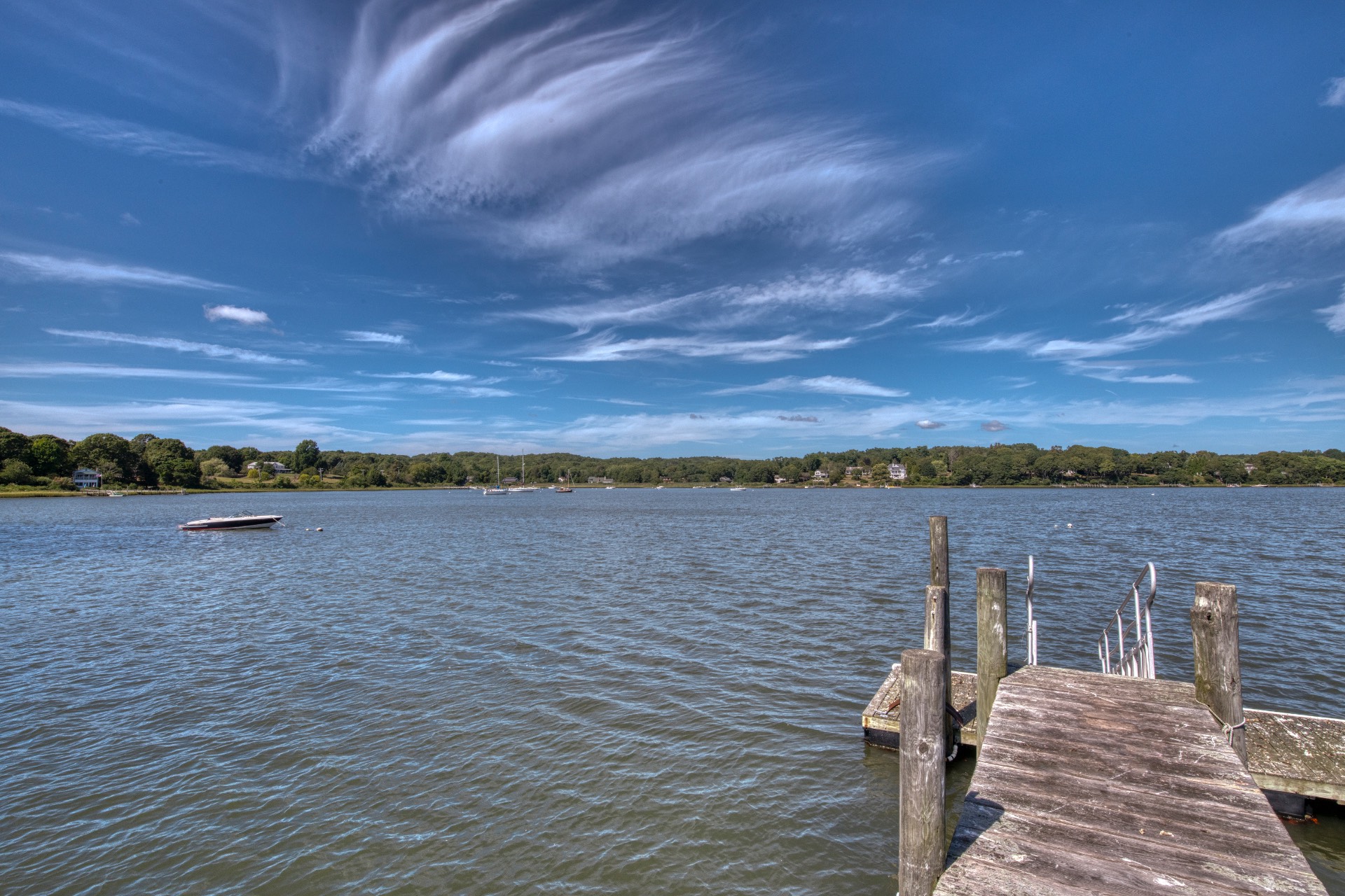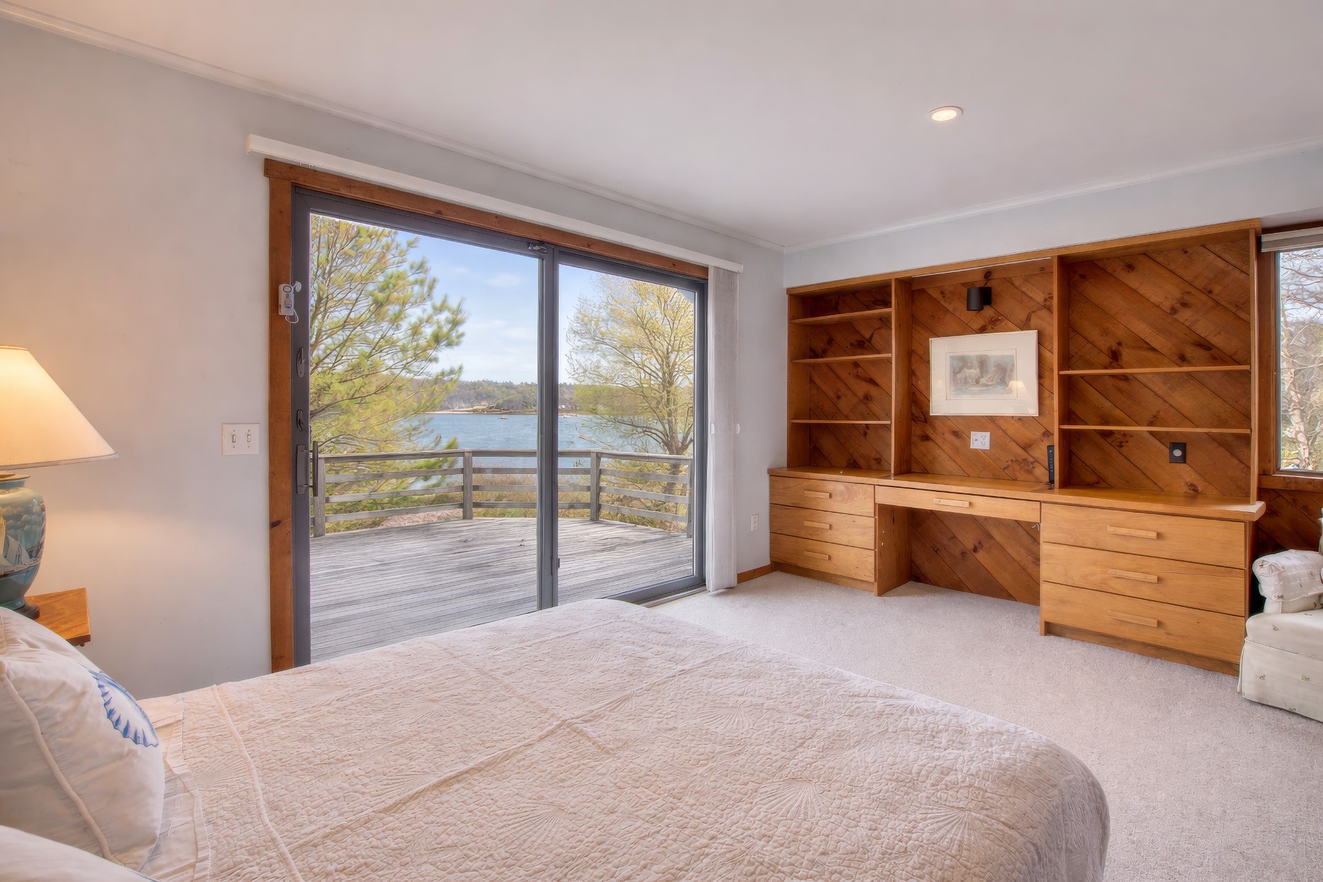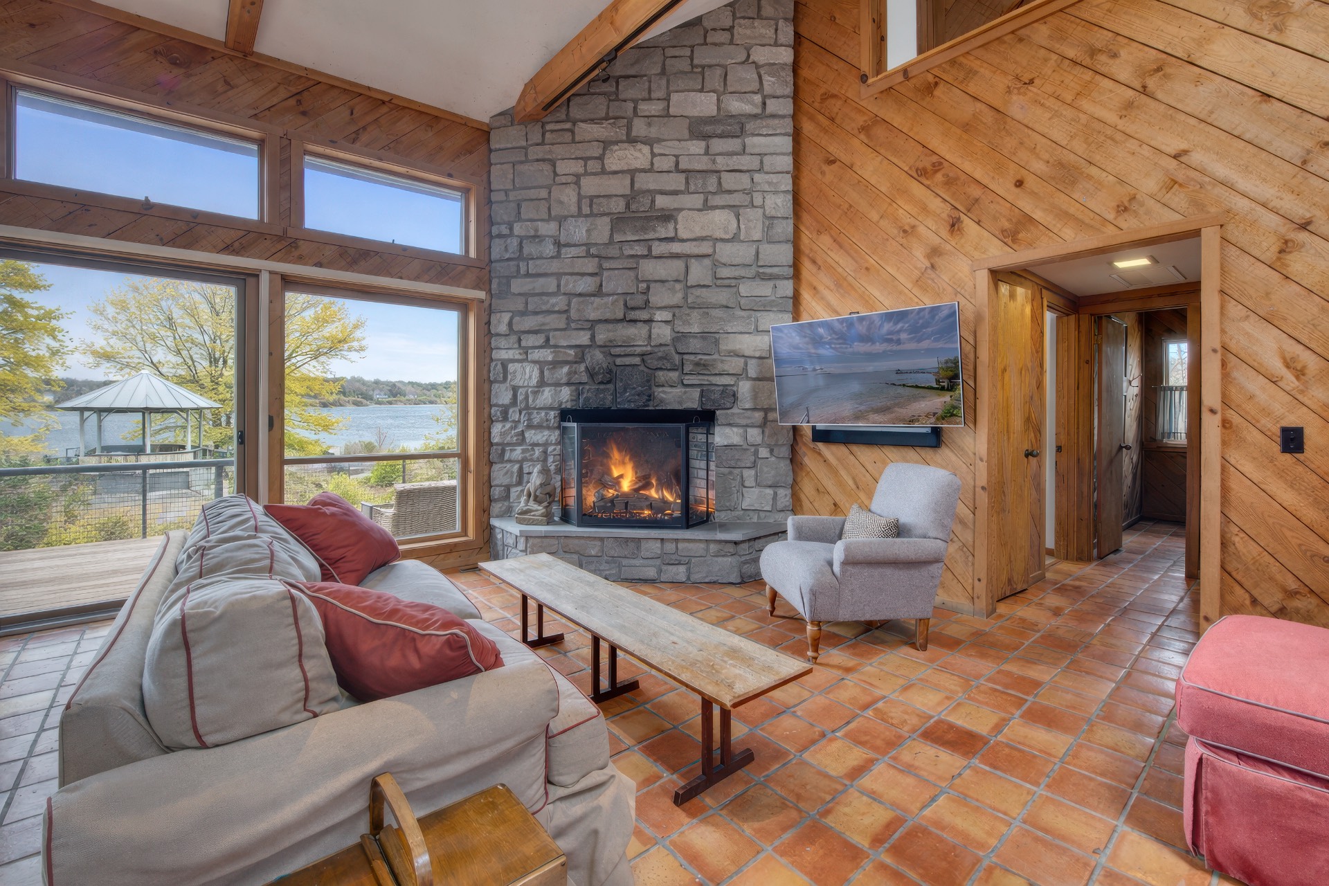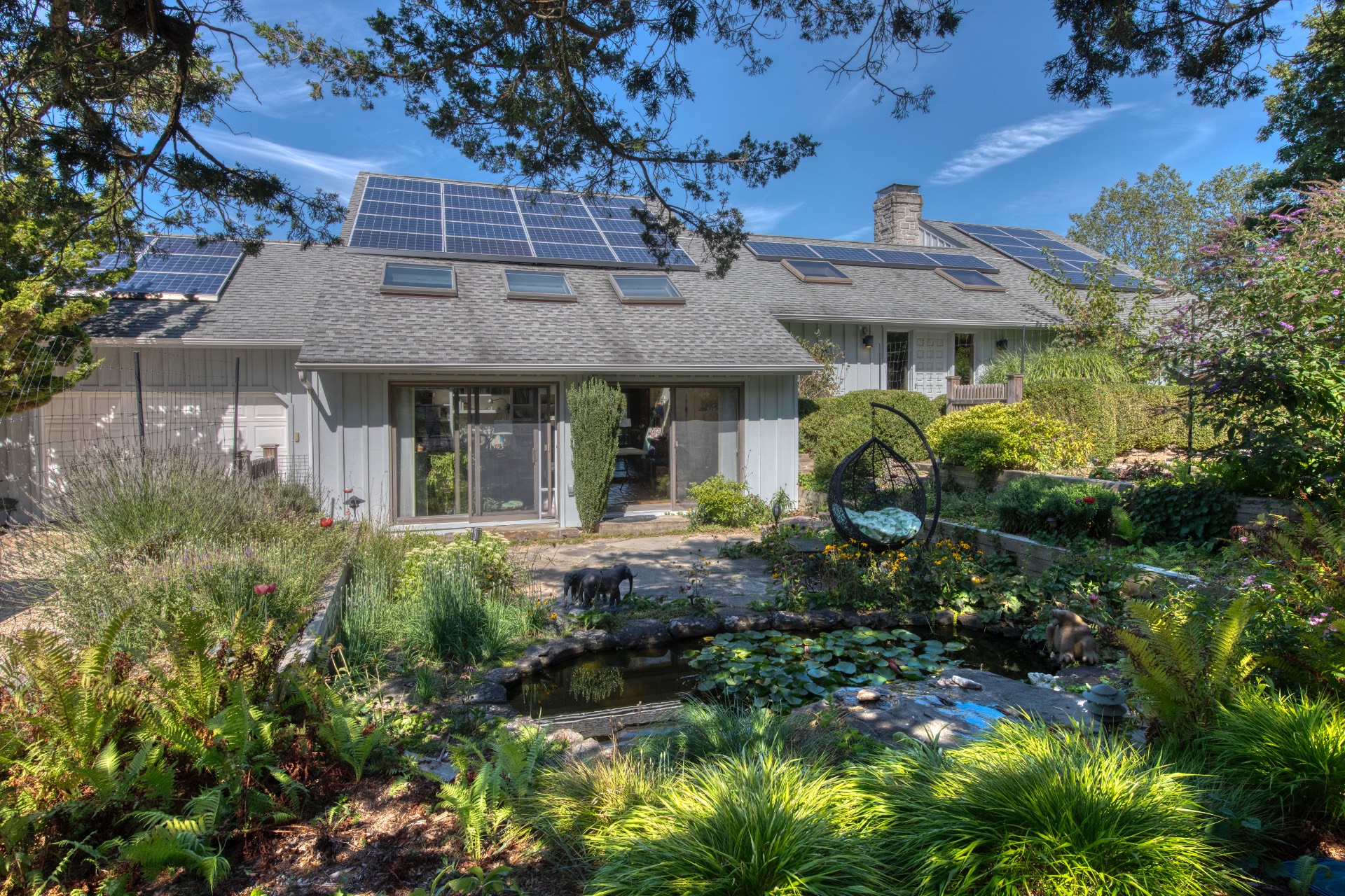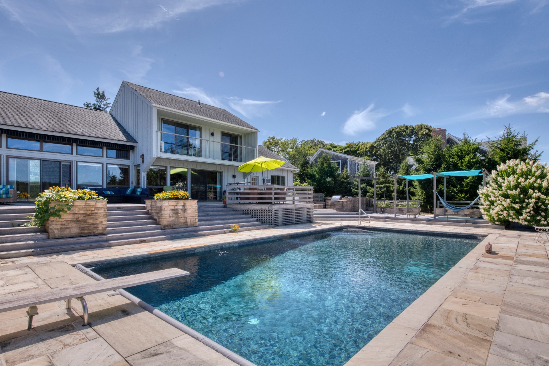 Stunning waterfront views overlooking West Neck Bay in the Westmoreland area of Shelter Island. This 4 bedroom, 3.5 bath Contemporary on 1.4 beautiful acres has an open plan living and dining area with stone fireplace, beamed and vaulted ceilings with expansive glass across the waterside overlooking a large deck, heated gunite pool, patio with outdoor kitchen, gazebo and dock. The main floor also has a kitchen with waterview, convenient pantry, 1/2 bath, art studio overlooking a charmingly landscaped water lily pond with specimen plants and flowers plus a two car garage on the west side of the common areas and full bath with two bedrooms, one of which has water views and deck, on the east side. The second floor is accessed by two staircases leading to a large primary ensuite bedroom with private bath, jaccuzzi tub, separate shower, office and balcony deck on one side and a private guest suite with bath and balcony deck on the other. The views from this floor are spectacular. The large finished basement has access to a stone patio leading out to the waterfront and has ample storage and utility rooms. The waterside is an amazing area for entertaining and relaxation with beautiful heated pool, patio, deck, reading, hammock and grilling areas. The property is lovingly landscaped and accessed by a private drive with large parking area. Fully heated with central air conditioning and extensive solar panelling, this home makes a wonderful vacation or year round living experience surrounded by nature, open skies and sea.