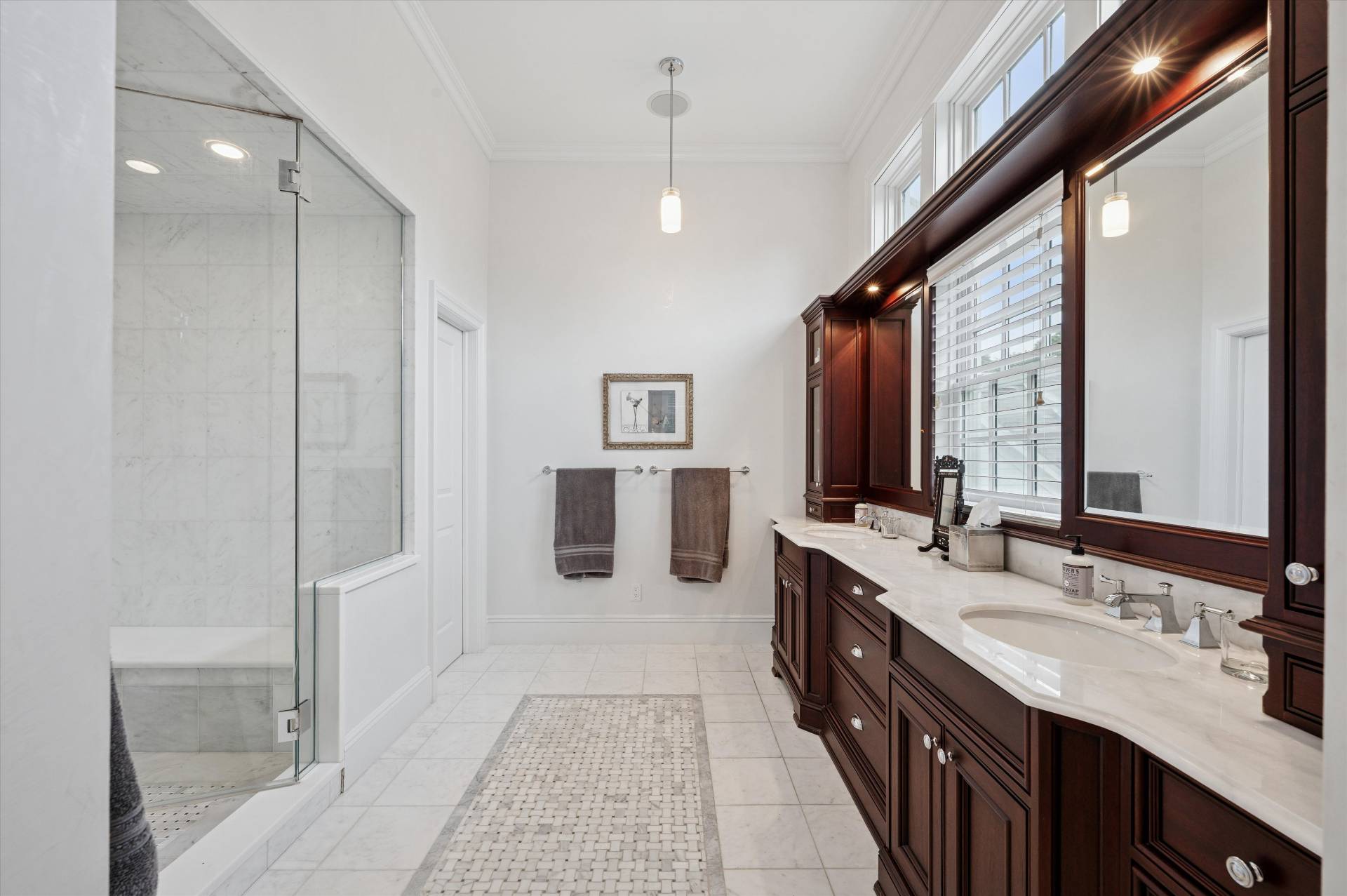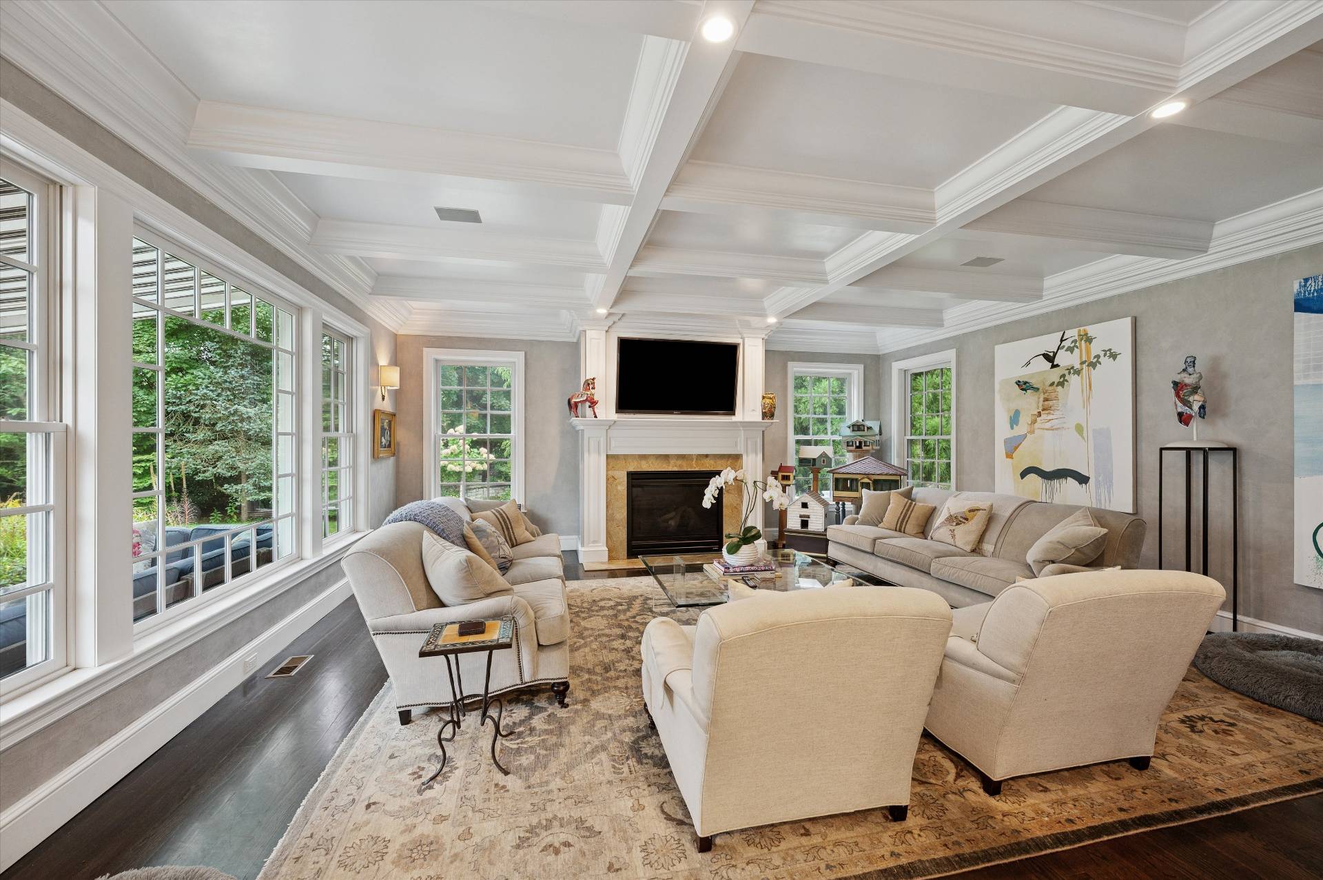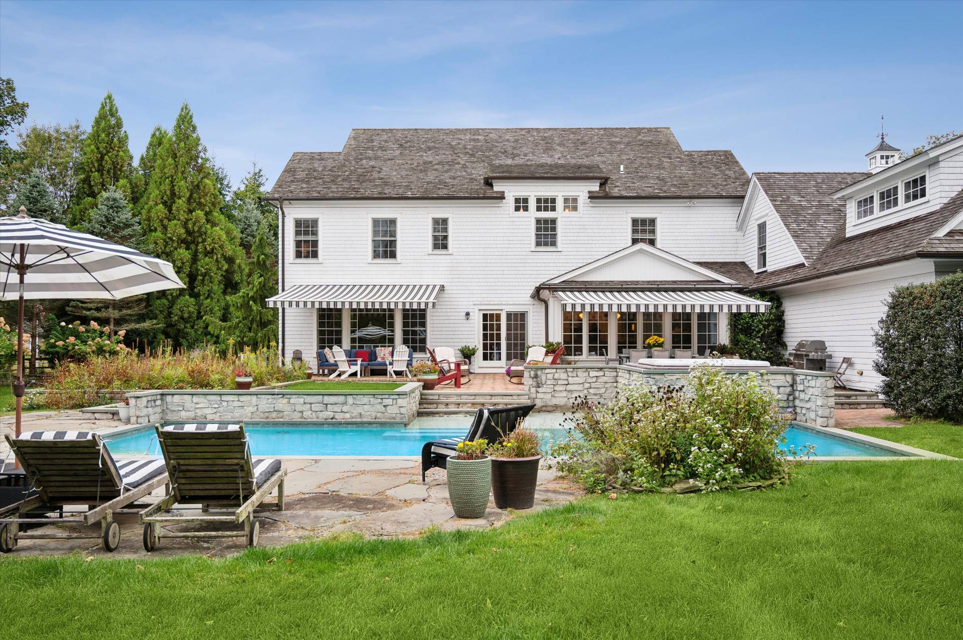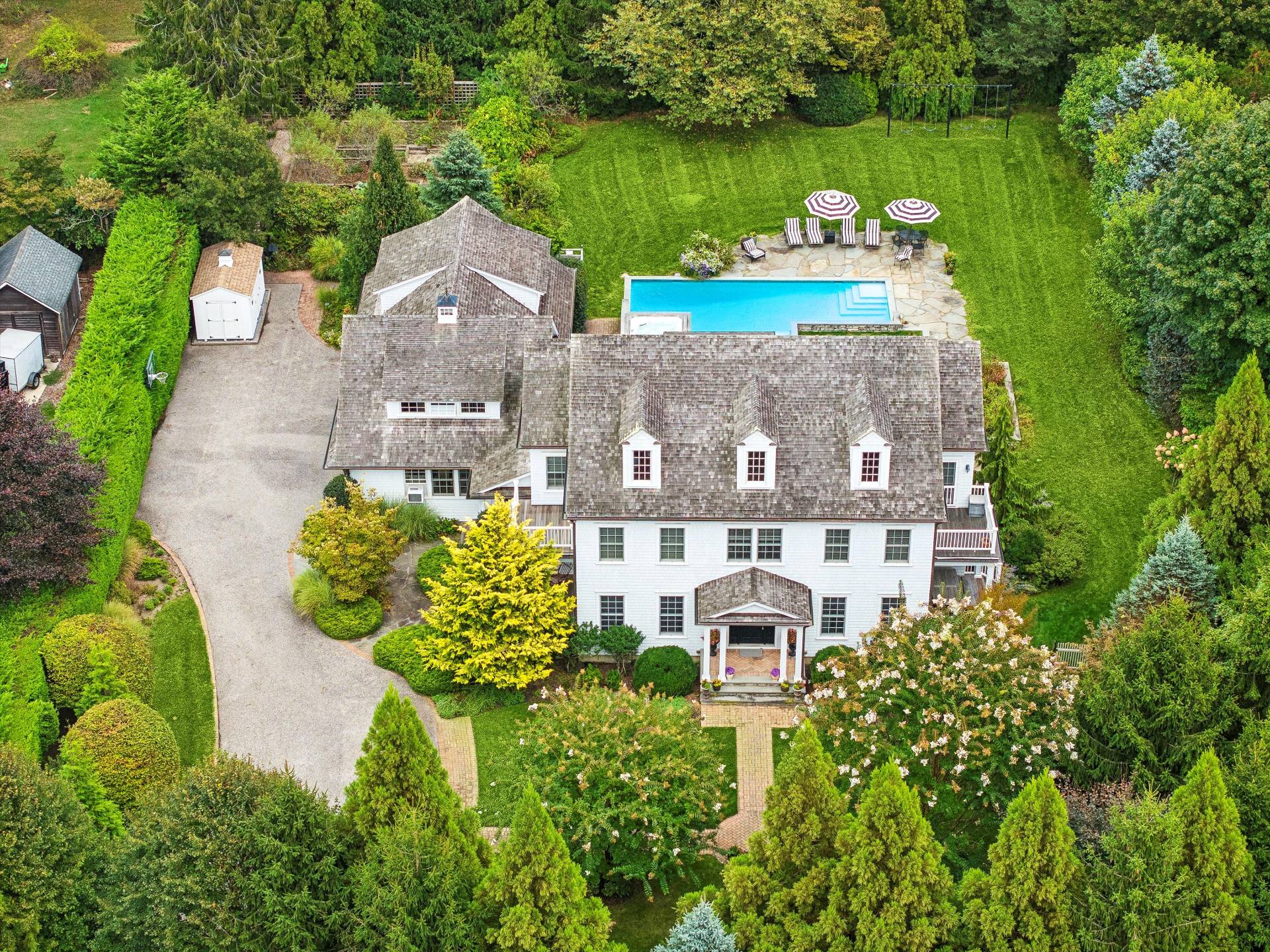 Privately set behind a gated entry on a maturely landscaped acre, just 65 miles from New York City, this custom-built estate located in East Moriches offers more than 4,700± square feet of refined living across three levels with an additional 1,300sqft finished lower level. Designed with historic architectural detailing and modern amenities, the home balances elegance, warmth, and functionality in every room. A dramatic double-height foyer introduces the residence, leading into elevated living space with 9' coffered ceilings on the main level, hand-plastered walls, custom woodwork, and hand-painted finishes throughout. The chef's kitchen is a centerpiece, complete with Viking and Subzero appliances, custom hand-painted flooring, two sinks, extensive counter seating, and an oversized breakfast room overlooking the grounds through floor-to-ceiling windows. Adjoining spaces include a butler's pantry, formal dining room, sitting room, and an expansive living room anchored by a wood burning fireplace, creating a seamless flow for entertaining. The second floor, with 8' ceilings, offers four bedrooms including a sun-filled primary suite with its own private terrace. The spa-like primary bath is finished with radiant-heated floors, marble tiling, an oversized dressing room, and a steam shower. In total, the home offers two full bathrooms and three powder rooms. On the lower level, 10' ceilings frame a fully finished basement with a gym, media room, bathroom, ample storage, and flexibility for future expansion. The third floor provides unfinished space with further potential, while the heated three-car garage with custom glass doors includes a finished loft with a powder room-ideal for a home office or studio. A formal foyer and a mudroom with laundry and storage add both function and convenience. Outdoors, the property is designed as a private sanctuary. A heated gunite saltwater pool with waterfall feature and whirlpool spa is surrounded by a brick patio and outdoor shower. An elevated, vegetable garden and orchard provide a lush, productive landscape. Mature trees and professional plantings enhance the sense of privacy, offering a sense of calm and beauty. This property also includes buy-in rights to nearby Hamptons beaches, expanding the lifestyle this estate affords beyond the gates and into the shoreline community. Every detail reflects thoughtful craftsmanship and timeless appeal, combining gated seclusion with versatile living and effortless access to the city. **Seller has filed for and is in the process of obtaining an updated Certificate of Occupancy to reflect the finished basement and finished room above the garage. Current square footage is broken down as follows: Main House (3,786 sq. ft.), Basement (1,351 sq. ft.), and Office/Loft (938 sq. ft.).**