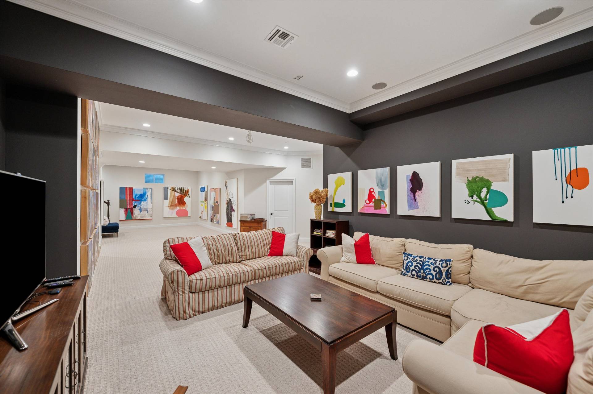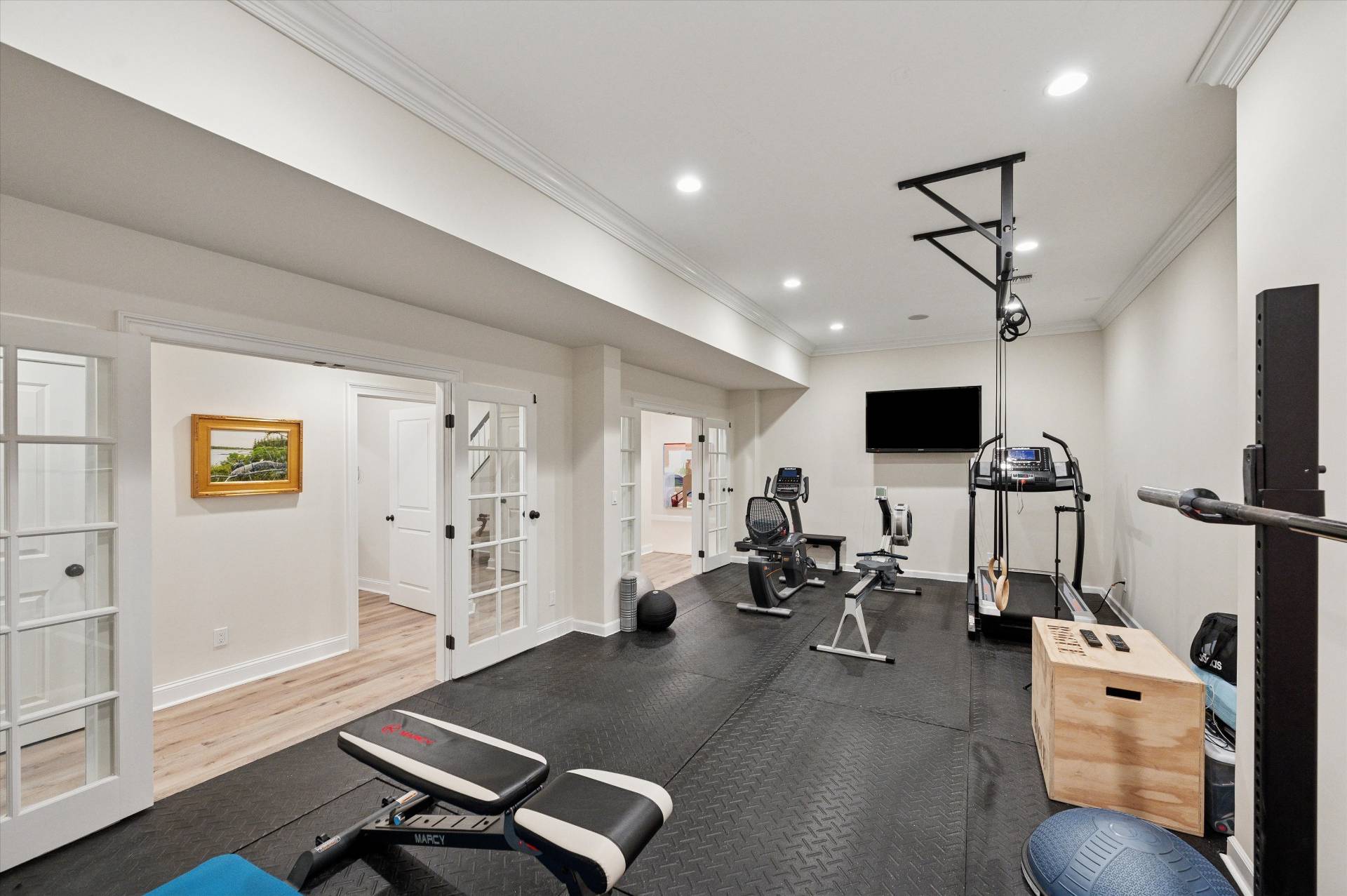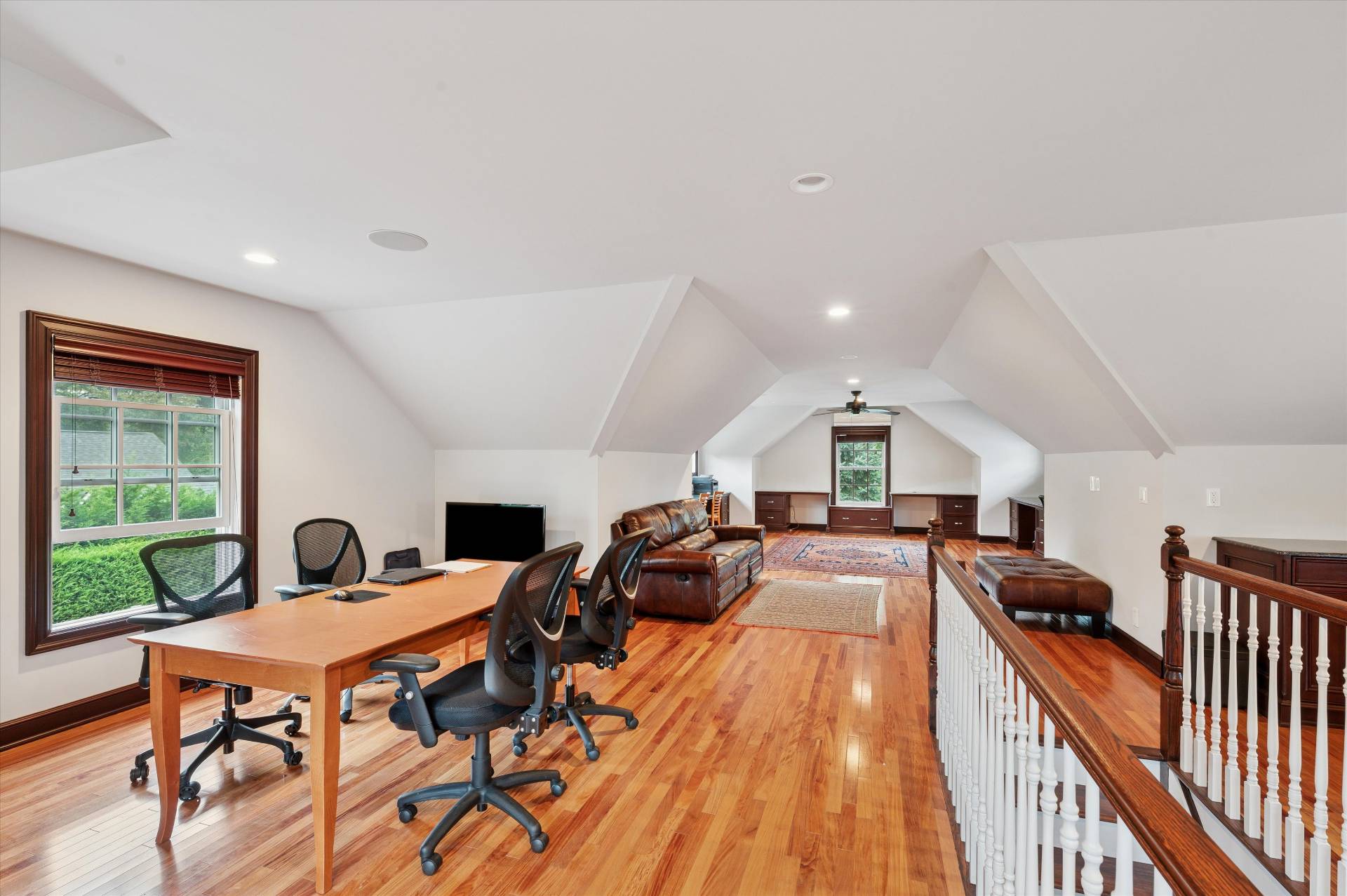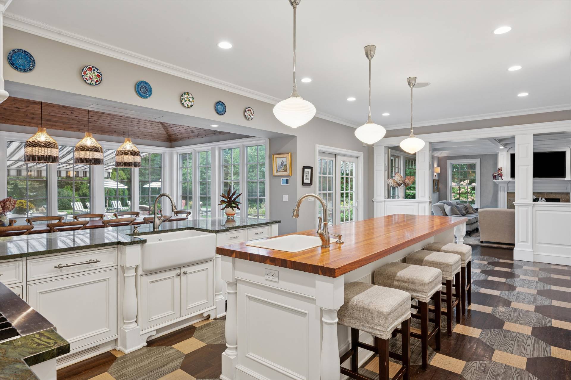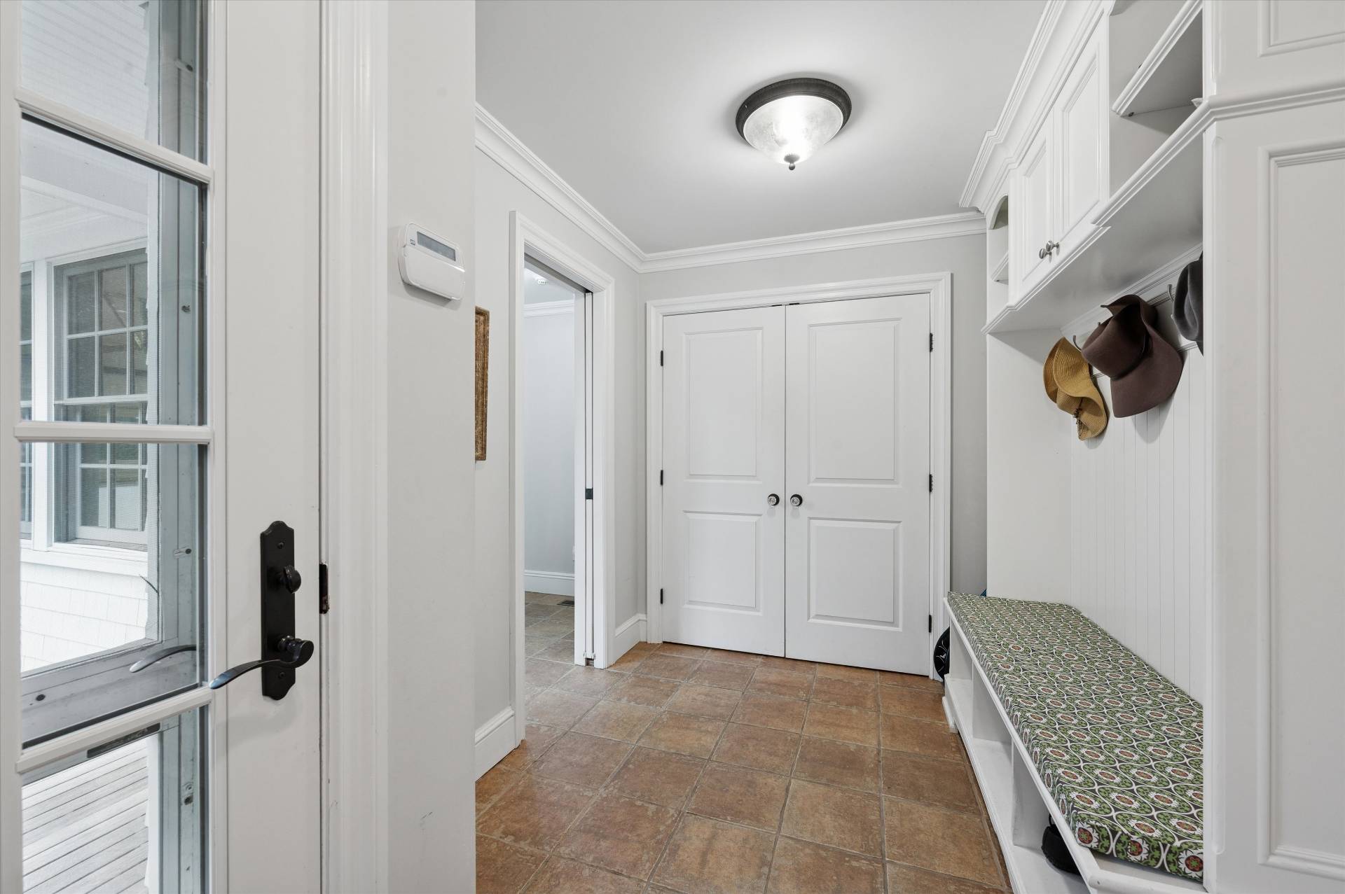 Privately set behind a gated entry on a maturely landscaped acre, just 65 miles from New York City, this custom-built estate located in East Moriches offers more than 4,700± square feet of refined living across three levels with an additional 1,300sqft finished lower level. Designed with historic architectural detailing and modern amenities, the home balances elegance, warmth, and functionality in every room. A dramatic double-height foyer introduces the residence, leading into elevated living space with 9' coffered ceilings on the main level, hand-plastered walls, custom woodwork, and hand-painted finishes throughout. The chef's kitchen is a centerpiece, complete with Viking and Subzero appliances, custom hand-painted flooring, two sinks, extensive counter seating, and an oversized breakfast room overlooking the grounds through floor-to-ceiling windows. Adjoining spaces include a butler's pantry, formal dining room, sitting room, and an expansive living room anchored by a wood burning fireplace, creating a seamless flow for entertaining. The second floor, with 8' ceilings, offers four bedrooms including a sun-filled primary suite with its own private terrace. The spa-like primary bath is finished with radiant-heated floors, marble tiling, an oversized dressing room, and a steam shower. In total, the home offers two full bathrooms and three powder rooms. On the lower level, 10' ceilings frame a fully finished basement with a gym, media room, bathroom, ample storage, and flexibility for future expansion. The third floor provides unfinished space with further potential, while the heated three-car garage with custom glass doors includes a finished loft with a powder room-ideal for a home office or studio. A formal foyer and a mudroom with laundry and storage add both function and convenience. Outdoors, the property is designed as a private sanctuary. A heated gunite saltwater pool with waterfall feature and whirlpool spa is surrounded by a brick patio and outdoor shower. An elevated, vegetable garden and orchard provide a lush, productive landscape. Mature trees and professional plantings enhance the sense of privacy, offering a sense of calm and beauty. This property also includes buy-in rights to nearby Hamptons beaches, expanding the lifestyle this estate affords beyond the gates and into the shoreline community. Every detail reflects thoughtful craftsmanship and timeless appeal, combining gated seclusion with versatile living and effortless access to the city. **Seller has filed for and is in the process of obtaining an updated Certificate of Occupancy to reflect the finished basement and finished room above the garage. Current square footage is broken down as follows: Main House (3,786 sq. ft.), Basement (1,351 sq. ft.), and Office/Loft (938 sq. ft.).**