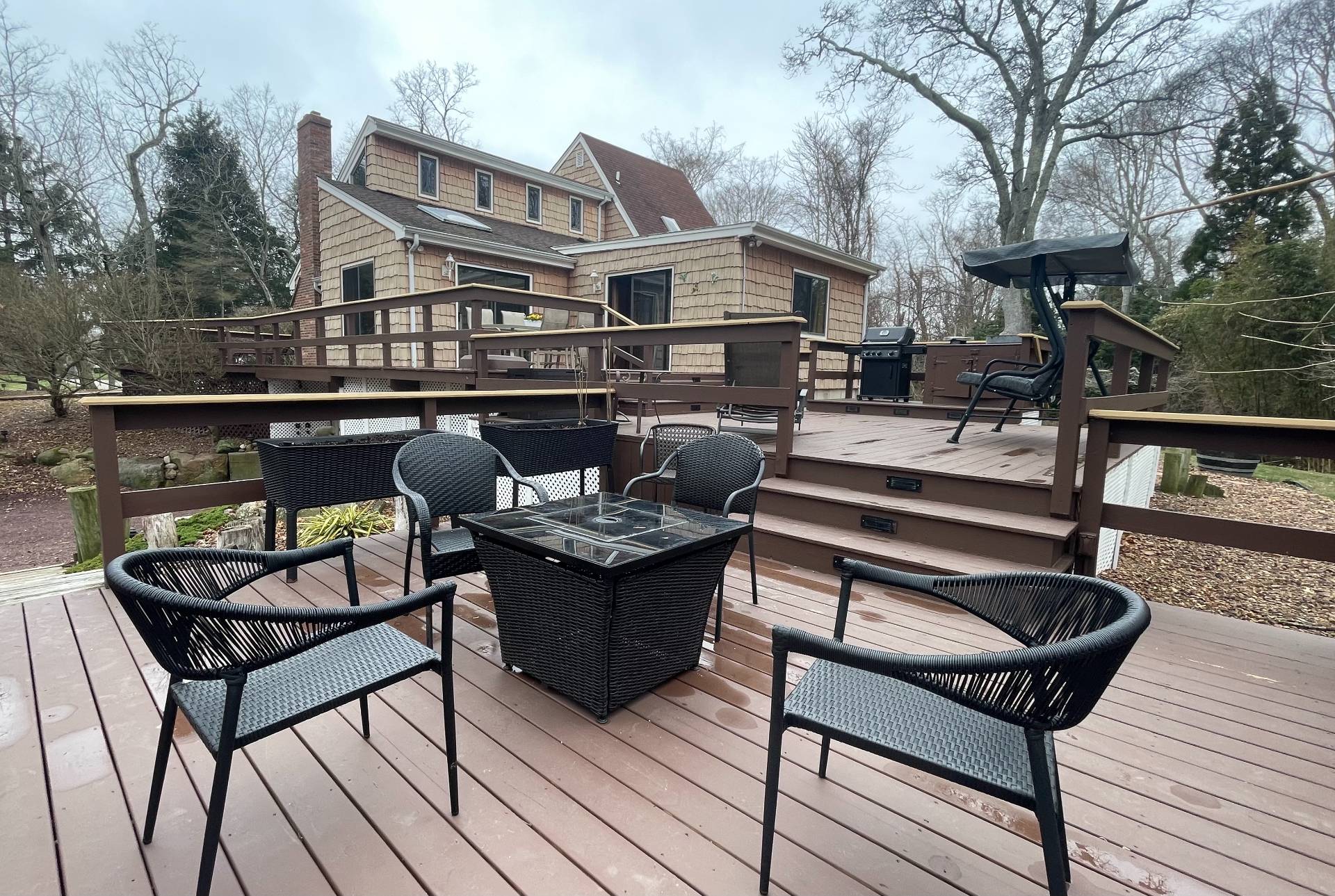 This island classic is truly a home for all seasons. The bright and open floor plan is beautifully complemented by the natural surroundings of Shelter Island, creating an inviting atmosphere throughout the year. The spacious living room and dining room feature sliding doors that open onto surrounding decks, making summer relaxation a breeze. A cozy fireplace offers comfort on the chilliest autumn evenings, providing a warm and inviting space to unwind. The kitchen and billiards room become the heart of the home during winter weekends with friends. Located on a quiet street and close to the hiking trails of Mashomack Preserve, making it ideal for spring adventures. The sandy shores of the nearby Wades Beach will bring you right back to summer fun and gatherings. With 3 bedrooms, 3 baths, and 1950 Sqft there is ample space for both family and visiting guests, ensuring comfort and convenience all year long. This Shelter Island retreat is truly a home for all.