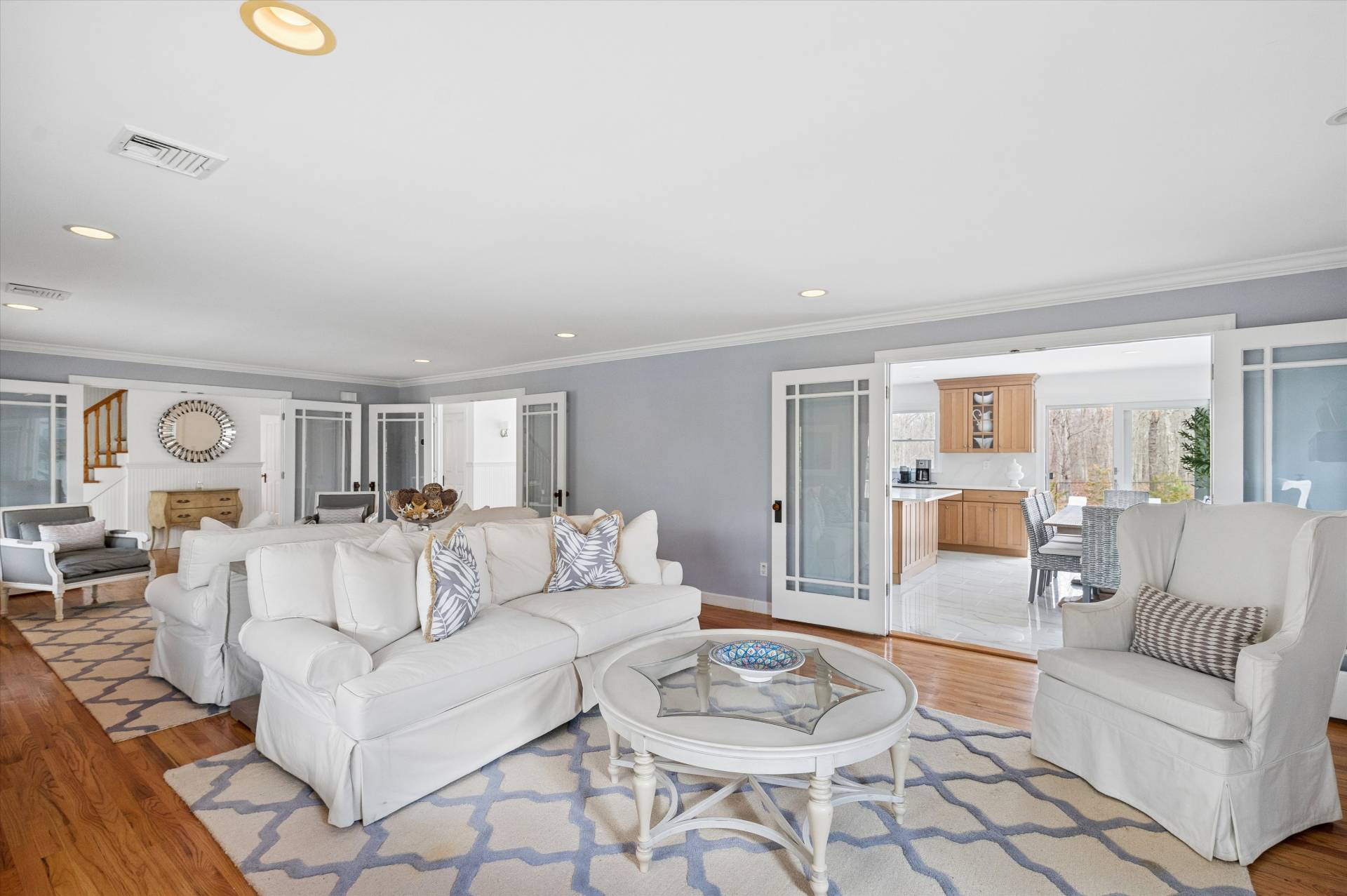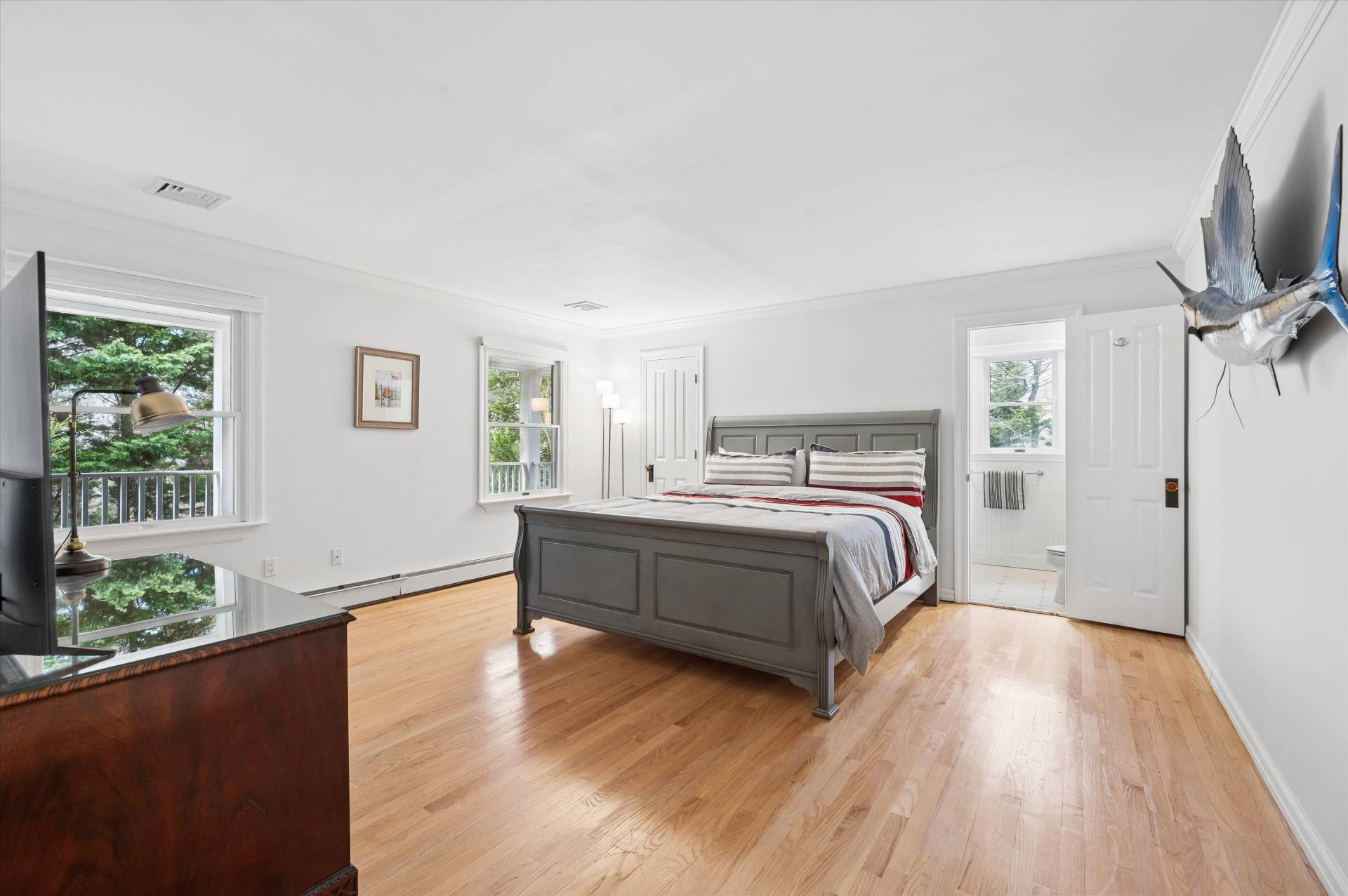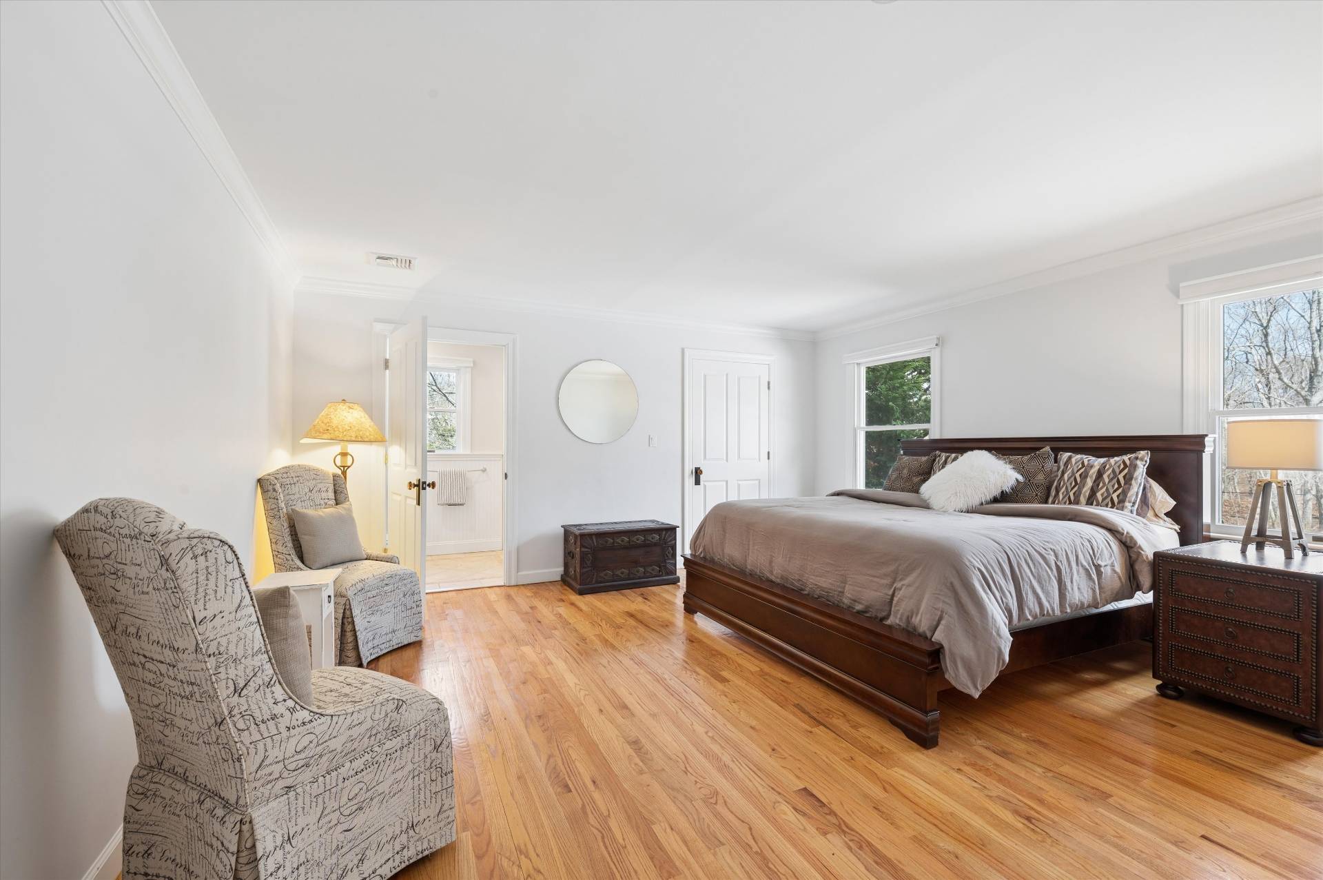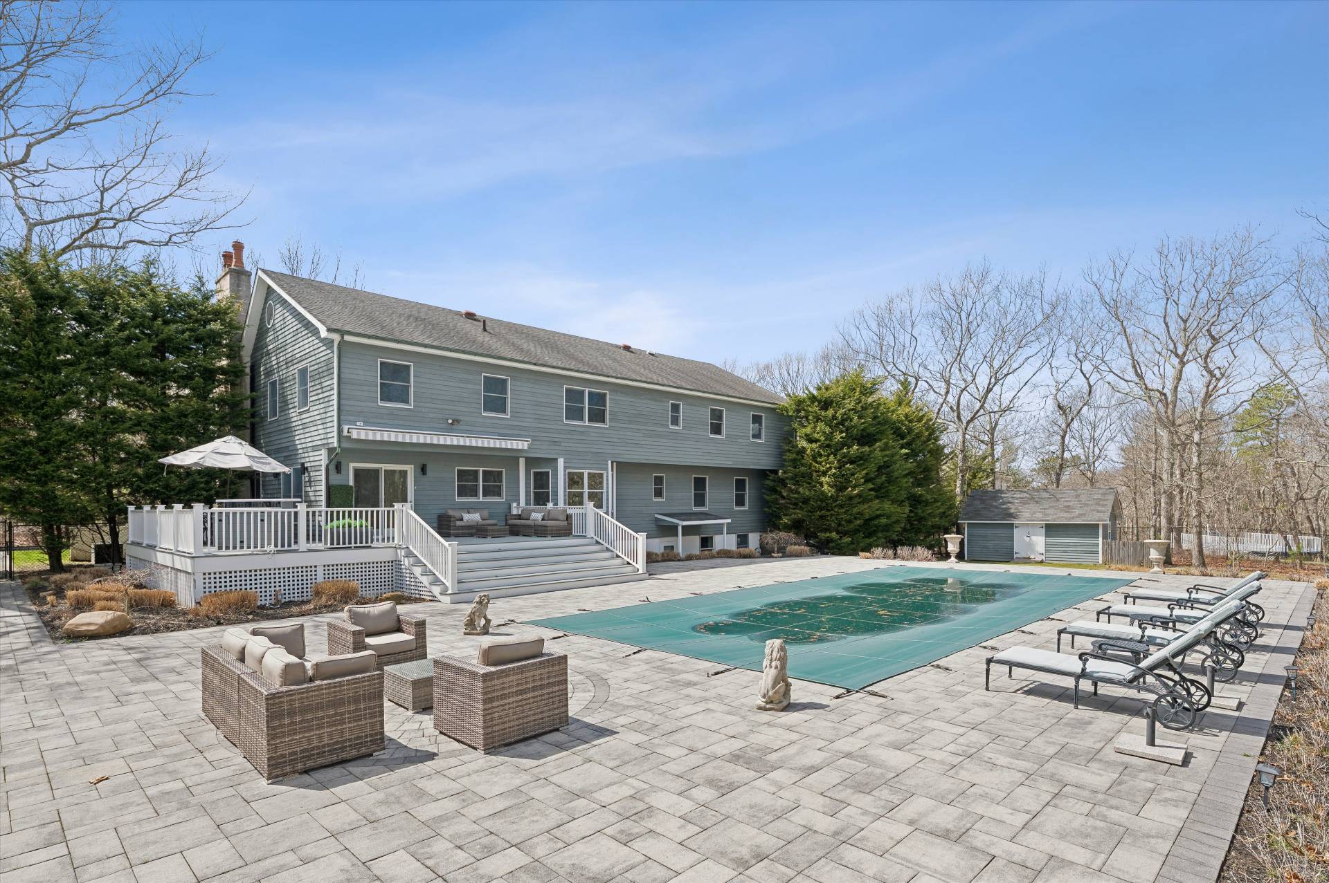 Welcome to a beautifully curated, turn-key Farmhouse set on just shy of an acre of lush, private grounds. An expansive front porch sets the tone, offering the perfect place to relax and take in the serene surroundings. Designed for both relaxed living and elegant entertaining, this exceptional home blends timeless charm with modern luxury. The heart of the home is a gourmet kitchen, thoughtfully laid out with high-end appliances and impeccable finishes, perfectly suited for both everyday living and hosting with ease. The inviting living room is anchored by a beautiful fireplace, creating a warm and sophisticated space to gather. Step outside to a stunning backyard retreat-complete with a sparkling pool and an expansive stone patio that creates a true resort-like setting. Whether hosting summer gatherings or enjoying quiet evenings under the stars, this outdoor space is simply unmatched. Inside, the home offers a thoughtfully designed layout with 5 bedrooms and 7 bathrooms, including two luxurious primary suites on the first floor, providing ultimate comfort and flexibility. Every bedroom is ensuite, ensuring privacy and convenience. A fully finished basement with a game room adds an additional level of living and entertainment space, perfect for recreation, hosting, or a private escape. Ideally situated just moments from West Landing Beach, Squire town Park, and Red Creek Pond, and in close proximity to some of the area's most well-known restaurants, this home offers the perfect balance of privacy and convenience. Beautiful finishes, abundant natural light, and impeccable attention to detail carry throughout, making this residence completely move-in ready. A rare offering that embodies effortless elegance, indoor-outdoor living, and the very best of Farmhouse sophistication. * Some Photos Virtually Enhanced
