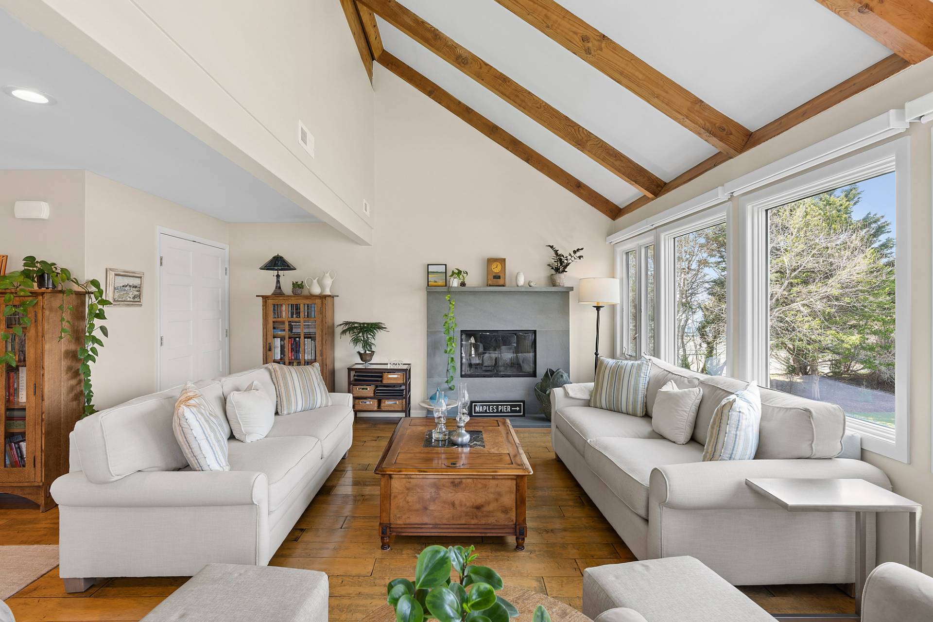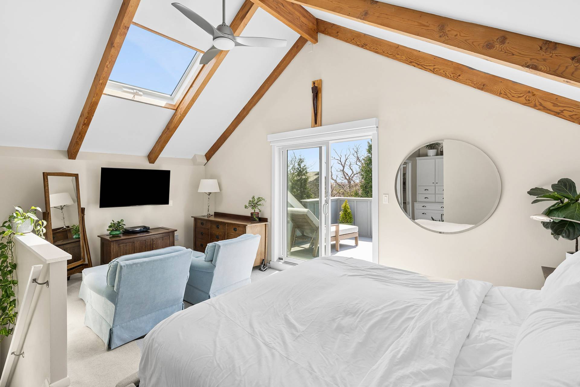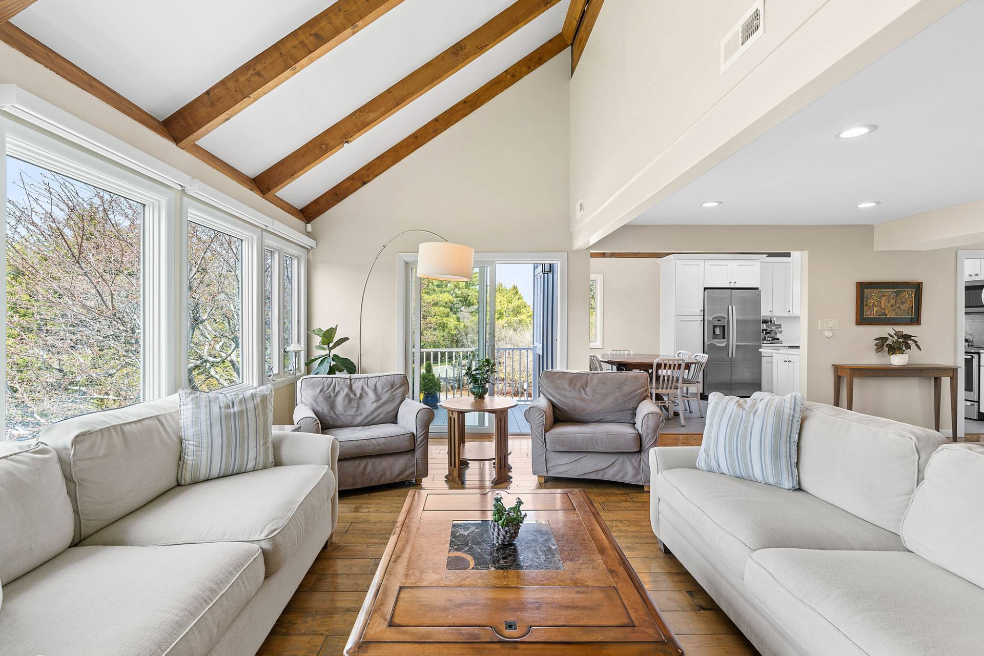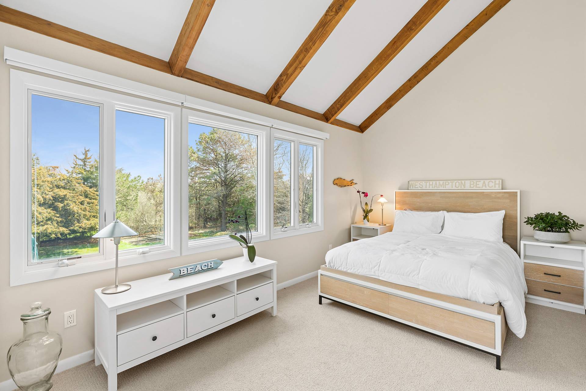 Situated on prestigious Meadow Lane, in the coveted Westhampton Beach Estate Section, this turn-key residence offers 2,402 SF of living space with 3 bedrooms and 3 full bathrooms, set on a beautifully landscaped acre. The property provides exceptional privacy and serenity, ideally located just 0.5 miles to Main Street and 1.3 miles to Dune Road-offering the rare combination of convenience and coastal tranquility, with the ocean close enough to hear at night. The home showcases soaring A-frame ceilings, exposed beams, and an abundance of natural light throughout. The main level welcomes you with hardwood flooring and a well-appointed kitchen featuring corian countertops, stainless steel appliances, and premium finishes, including a GE Profile 5-burner electric range with warming drawer, Bosch dishwasher, Whirlpool built-in microwave, and GE refrigerator. The adjacent living room is anchored by a wood-burning fireplace and opens to a front balcony through sliding glass doors, creating a seamless indoor-outdoor flow. Two generously sized bedrooms are located on this level, including one with three closets and direct access to a side deck, as well as a second bedroom overlooking the backyard and pool. A full hall bathroom with a tub/shower combination and a linen closet complete the floor. The upper level is dedicated to a private primary suite, offering a tranquil retreat with its own deck, skylight, walk-in closet, and custom built-in storage. The spa-inspired en-suite bath features a walk-in shower with river rock flooring, dual shower heads, a bench, and mirrored cabinetry, while pocket doors enhance both functionality and design. The lower level adds versatility with tiled flooring, a full bathroom, sliding glass doors to the backyard, and a convenient laundry closet. Outdoors, the fully deer-fenced property is designed for both relaxation and entertaining, with a bluestone patio, raised vegetable garden beds, and Trex decking surrounding the heated saltwater pool, all framed by raised beds home to lush, mature landscaping including hydrangeas, rhododendrons, hosts lilies, and crape myrtle. Additional features include full-property irrigation, durable Hardie board siding, an alarm system, exterior cameras, a Tesla charger, and multiple storage spaces. The home is also equipped with geothermal heating and central air conditioning, delivering efficient year-round comfort. 4 Meadow Lane presents a rare opportunity to own in one of the Hamptons' most desirable village locations-just moments from Main Street's shops and restaurants, the Westhampton Beach Performing Arts Center, and pristine ocean beaches. Whether as a year-round residence or a seasonal retreat, this property truly captures the essence of Hamptons living.