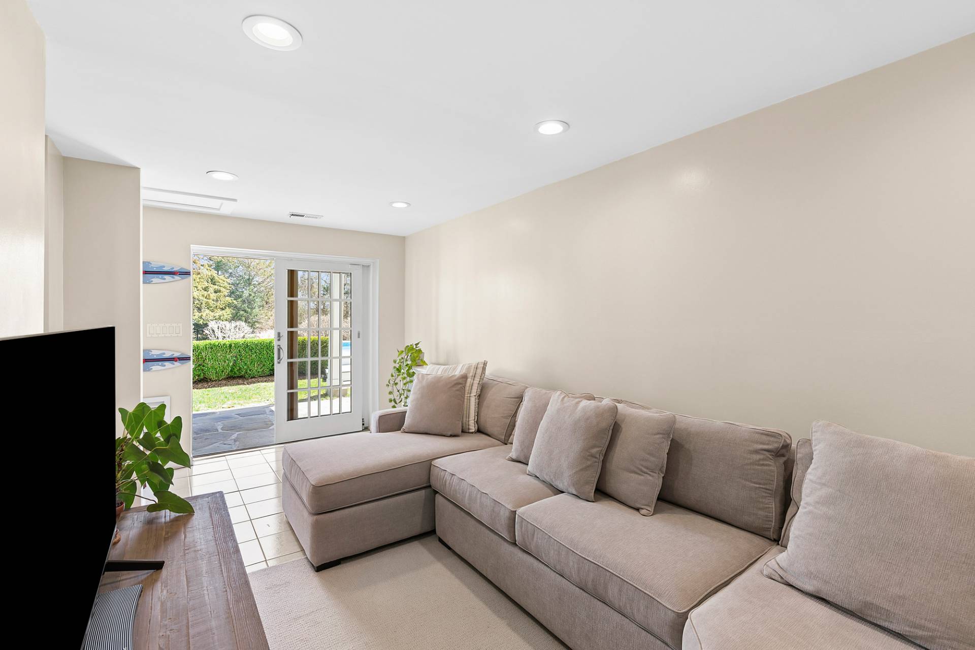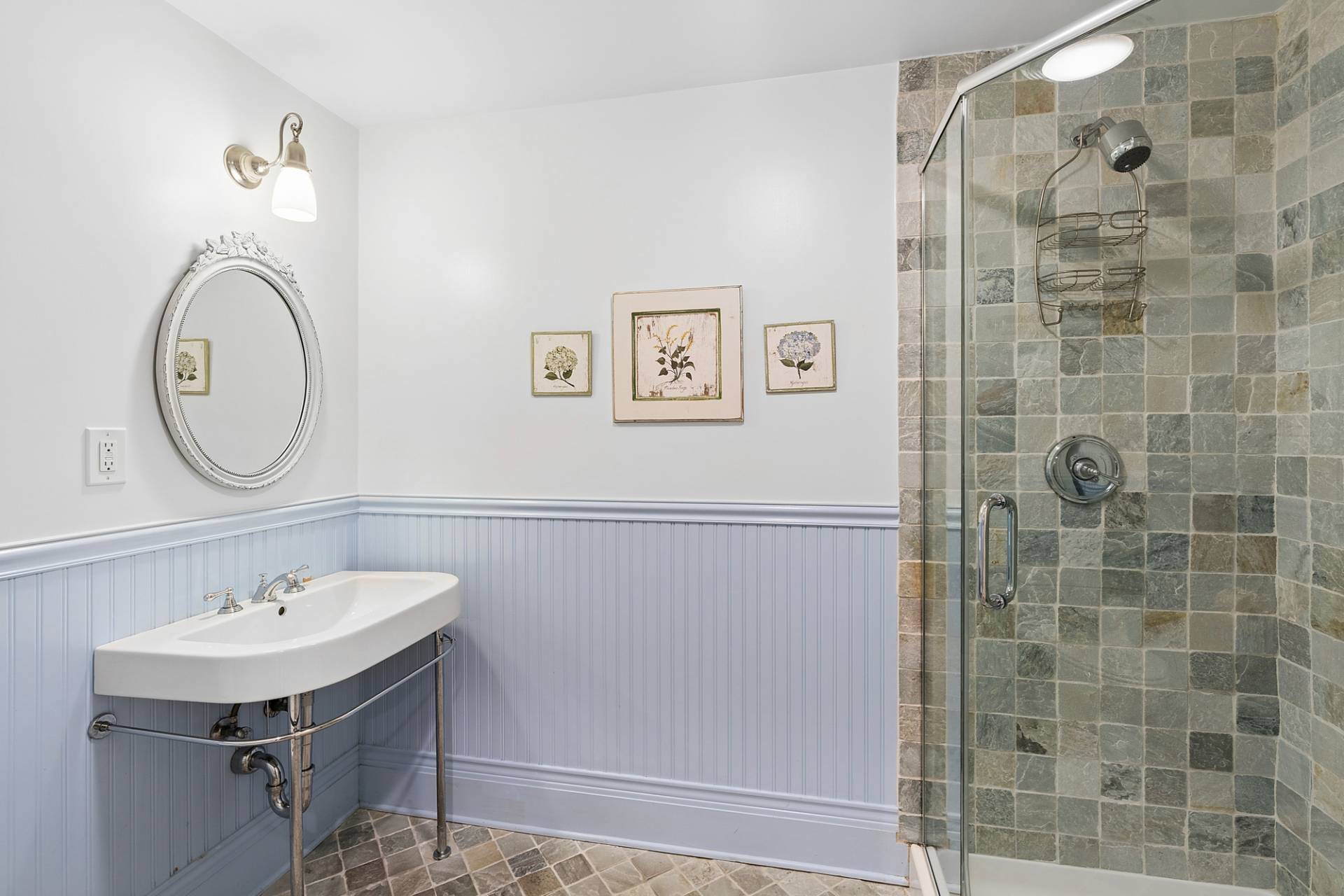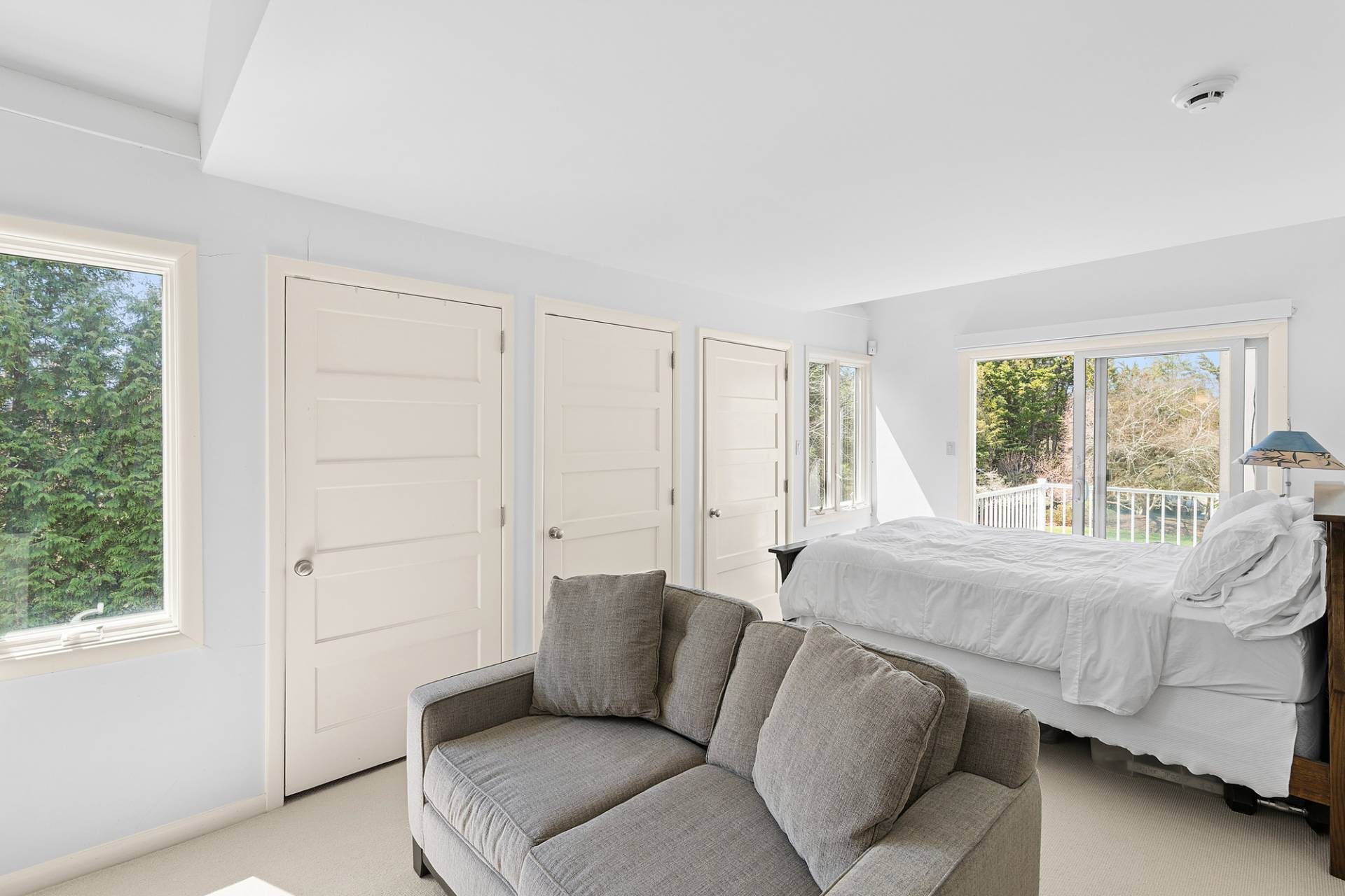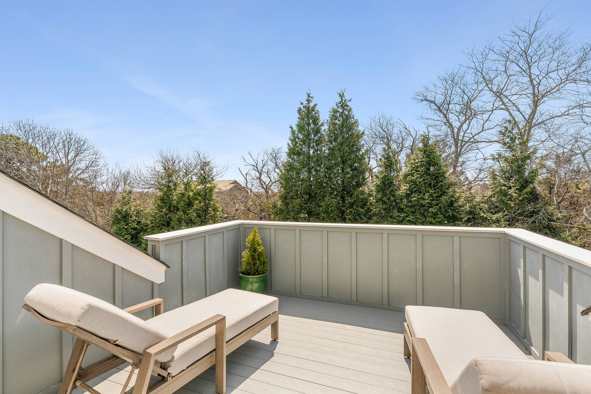 Situated on prestigious Meadow Lane, in the coveted Westhampton Beach Estate Section, this turn-key residence offers 2,402 SF of living space with 3 bedrooms and 3 full bathrooms, set on a beautifully landscaped acre. The property provides exceptional privacy and serenity, ideally located just 0.5 miles to Main Street and 1.3 miles to Dune Road-offering the rare combination of convenience and coastal tranquility, with the ocean close enough to hear at night. The home showcases soaring A-frame ceilings, exposed beams, and an abundance of natural light throughout. The main level welcomes you with hardwood flooring and a well-appointed kitchen featuring corian countertops, stainless steel appliances, and premium finishes, including a GE Profile 5-burner electric range with warming drawer, Bosch dishwasher, Whirlpool built-in microwave, and GE refrigerator. The adjacent living room is anchored by a wood-burning fireplace and opens to a front balcony through sliding glass doors, creating a seamless indoor-outdoor flow. Two generously sized bedrooms are located on this level, including one with three closets and direct access to a side deck, as well as a second bedroom overlooking the backyard and pool. A full hall bathroom with a tub/shower combination and a linen closet complete the floor. The upper level is dedicated to a private primary suite, offering a tranquil retreat with its own deck, skylight, walk-in closet, and custom built-in storage. The spa-inspired en-suite bath features a walk-in shower with river rock flooring, dual shower heads, a bench, and mirrored cabinetry, while pocket doors enhance both functionality and design. The lower level adds versatility with tiled flooring, a full bathroom, sliding glass doors to the backyard, and a convenient laundry closet. Outdoors, the fully deer-fenced property is designed for both relaxation and entertaining, with a bluestone patio, raised vegetable garden beds, and Trex decking surrounding the heated saltwater pool, all framed by raised beds home to lush, mature landscaping including hydrangeas, rhododendrons, hosts lilies, and crape myrtle. Additional features include full-property irrigation, durable Hardie board siding, an alarm system, exterior cameras, a Tesla charger, and multiple storage spaces. The home is also equipped with geothermal heating and central air conditioning, delivering efficient year-round comfort. 4 Meadow Lane presents a rare opportunity to own in one of the Hamptons' most desirable village locations-just moments from Main Street's shops and restaurants, the Westhampton Beach Performing Arts Center, and pristine ocean beaches. Whether as a year-round residence or a seasonal retreat, this property truly captures the essence of Hamptons living.