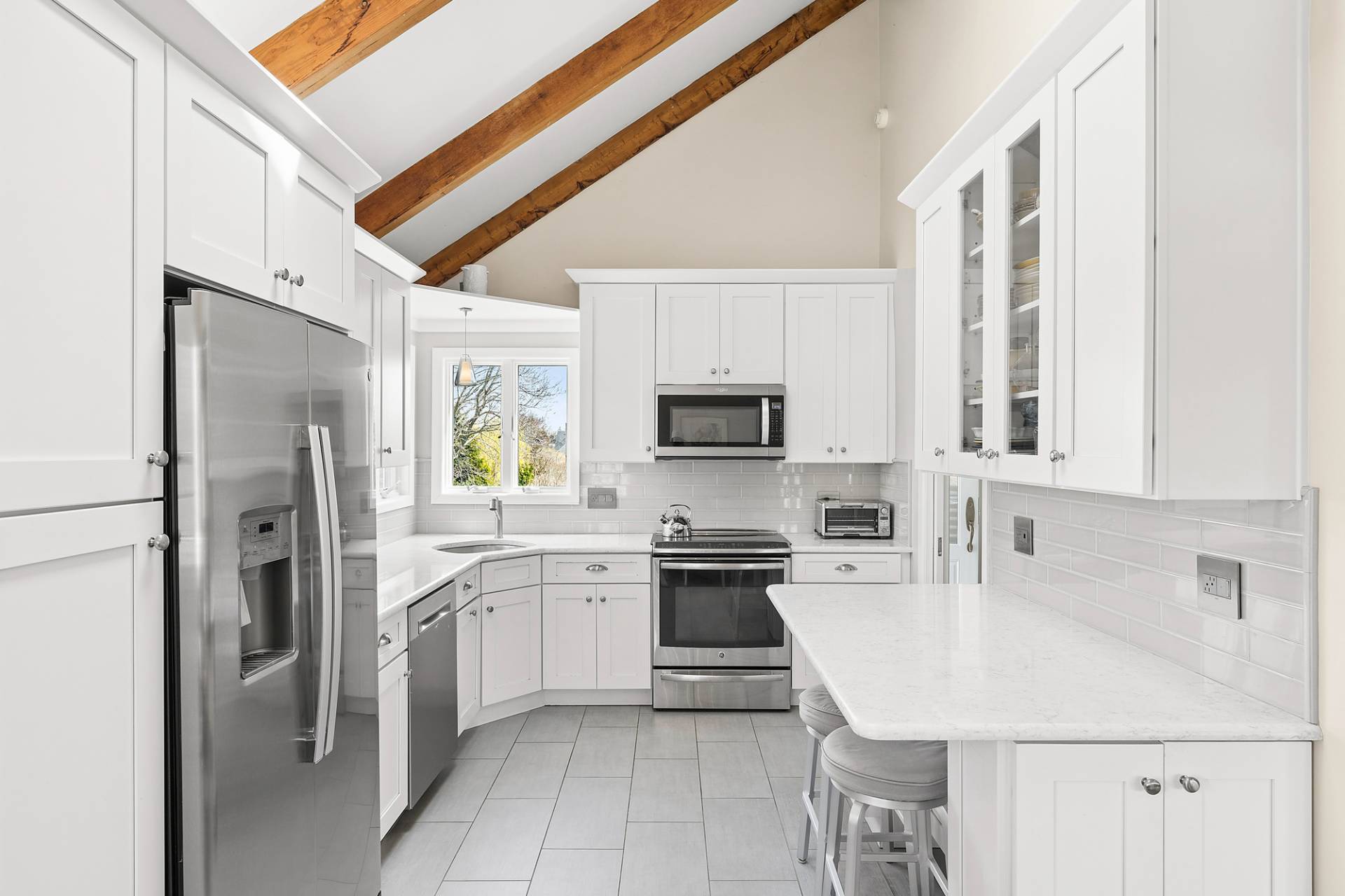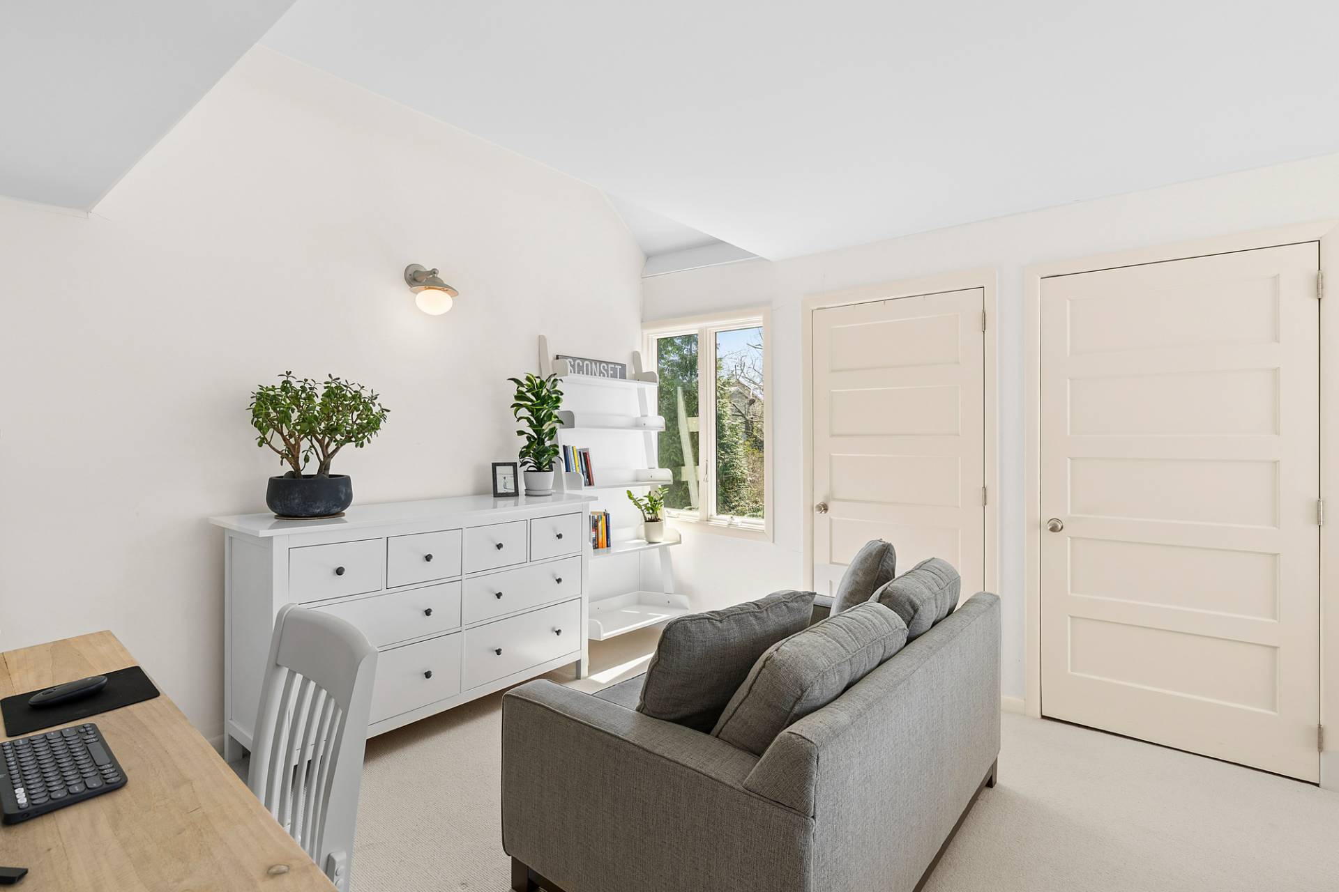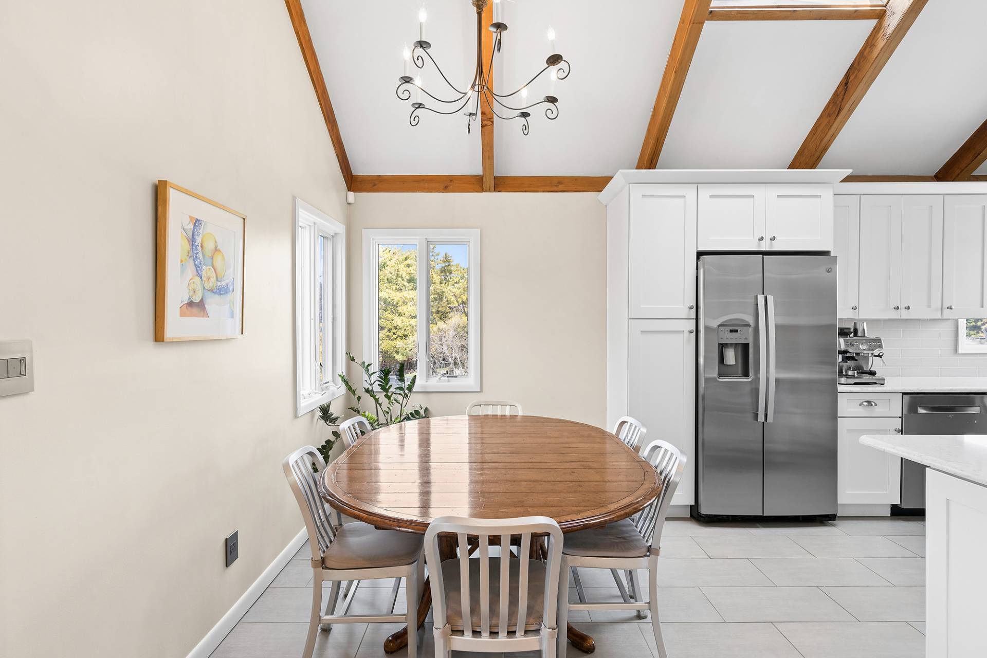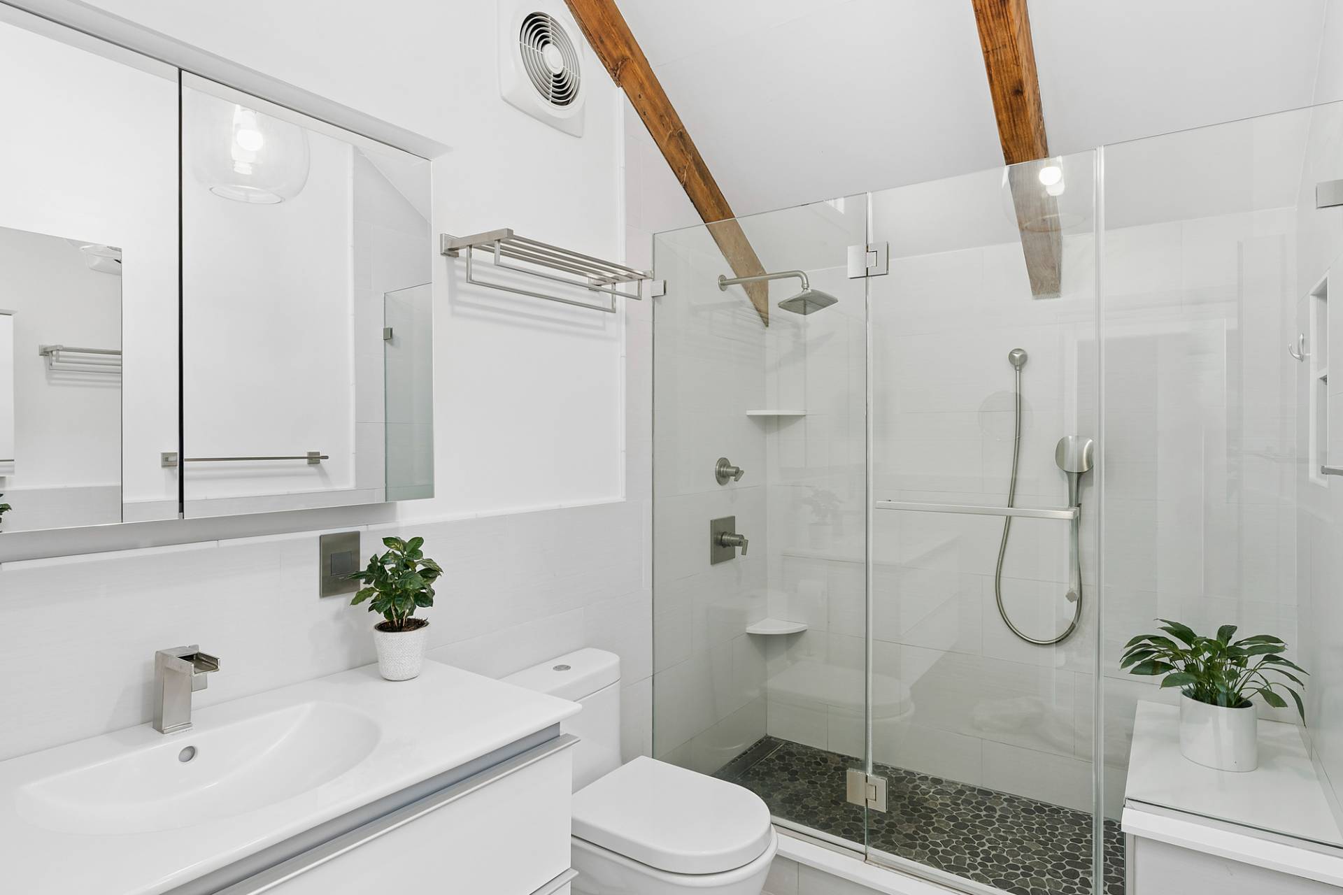 Situated on prestigious Meadow Lane, in the coveted Westhampton Beach Estate Section, this turn-key residence offers 2,402 SF of living space with 3 bedrooms and 3 full bathrooms, set on a beautifully landscaped acre. The property provides exceptional privacy and serenity, ideally located just 0.5 miles to Main Street and 1.3 miles to Dune Road-offering the rare combination of convenience and coastal tranquility, with the ocean close enough to hear at night. The home showcases soaring A-frame ceilings, exposed beams, and an abundance of natural light throughout. The main level welcomes you with hardwood flooring and a well-appointed kitchen featuring corian countertops, stainless steel appliances, and premium finishes, including a GE Profile 5-burner electric range with warming drawer, Bosch dishwasher, Whirlpool built-in microwave, and GE refrigerator. The adjacent living room is anchored by a wood-burning fireplace and opens to a front balcony through sliding glass doors, creating a seamless indoor-outdoor flow. Two generously sized bedrooms are located on this level, including one with three closets and direct access to a side deck, as well as a second bedroom overlooking the backyard and pool. A full hall bathroom with a tub/shower combination and a linen closet complete the floor. The upper level is dedicated to a private primary suite, offering a tranquil retreat with its own deck, skylight, walk-in closet, and custom built-in storage. The spa-inspired en-suite bath features a walk-in shower with river rock flooring, dual shower heads, a bench, and mirrored cabinetry, while pocket doors enhance both functionality and design. The lower level adds versatility with tiled flooring, a full bathroom, sliding glass doors to the backyard, and a convenient laundry closet. Outdoors, the fully deer-fenced property is designed for both relaxation and entertaining, with a bluestone patio, raised vegetable garden beds, and Trex decking surrounding the heated saltwater pool, all framed by raised beds home to lush, mature landscaping including hydrangeas, rhododendrons, hosts lilies, and crape myrtle. Additional features include full-property irrigation, durable Hardie board siding, an alarm system, exterior cameras, a Tesla charger, and multiple storage spaces. The home is also equipped with geothermal heating and central air conditioning, delivering efficient year-round comfort. 4 Meadow Lane presents a rare opportunity to own in one of the Hamptons' most desirable village locations-just moments from Main Street's shops and restaurants, the Westhampton Beach Performing Arts Center, and pristine ocean beaches. Whether as a year-round residence or a seasonal retreat, this property truly captures the essence of Hamptons living.